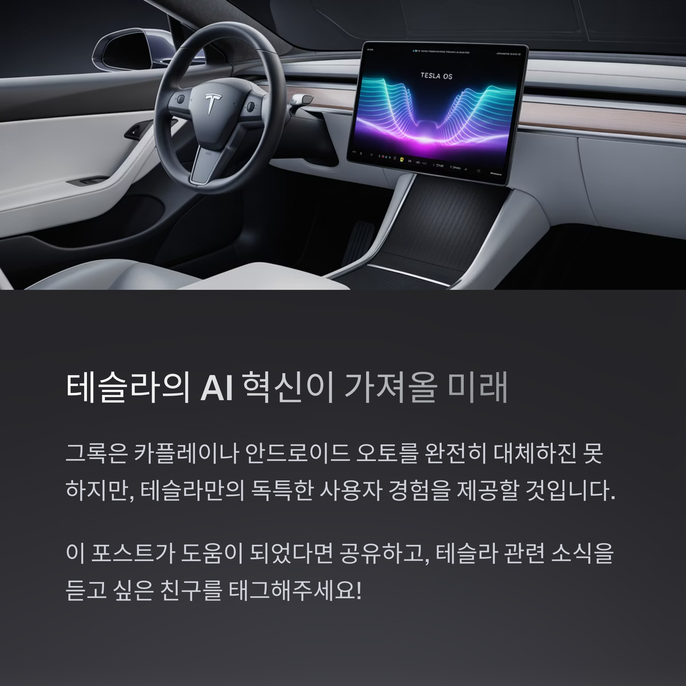 테슬라 차량에 그록(Grok)이 기본 탑재되면, 애플 카플레이나 안드로이드 오토 같은 기존 스마트폰 연동 시스템과의 호환은 어떻게 될까요? 현재까지 테슬라는 자사 독자 운영체제를 고수하고 있으며, 외부 플랫폼과의 연결을 제한하고 있는 상황입니다. 하지만 그록 도입 이후 변화 가능성과 기술적 관점에서의 연동 여부를 현실적으로 짚어보겠습니다.