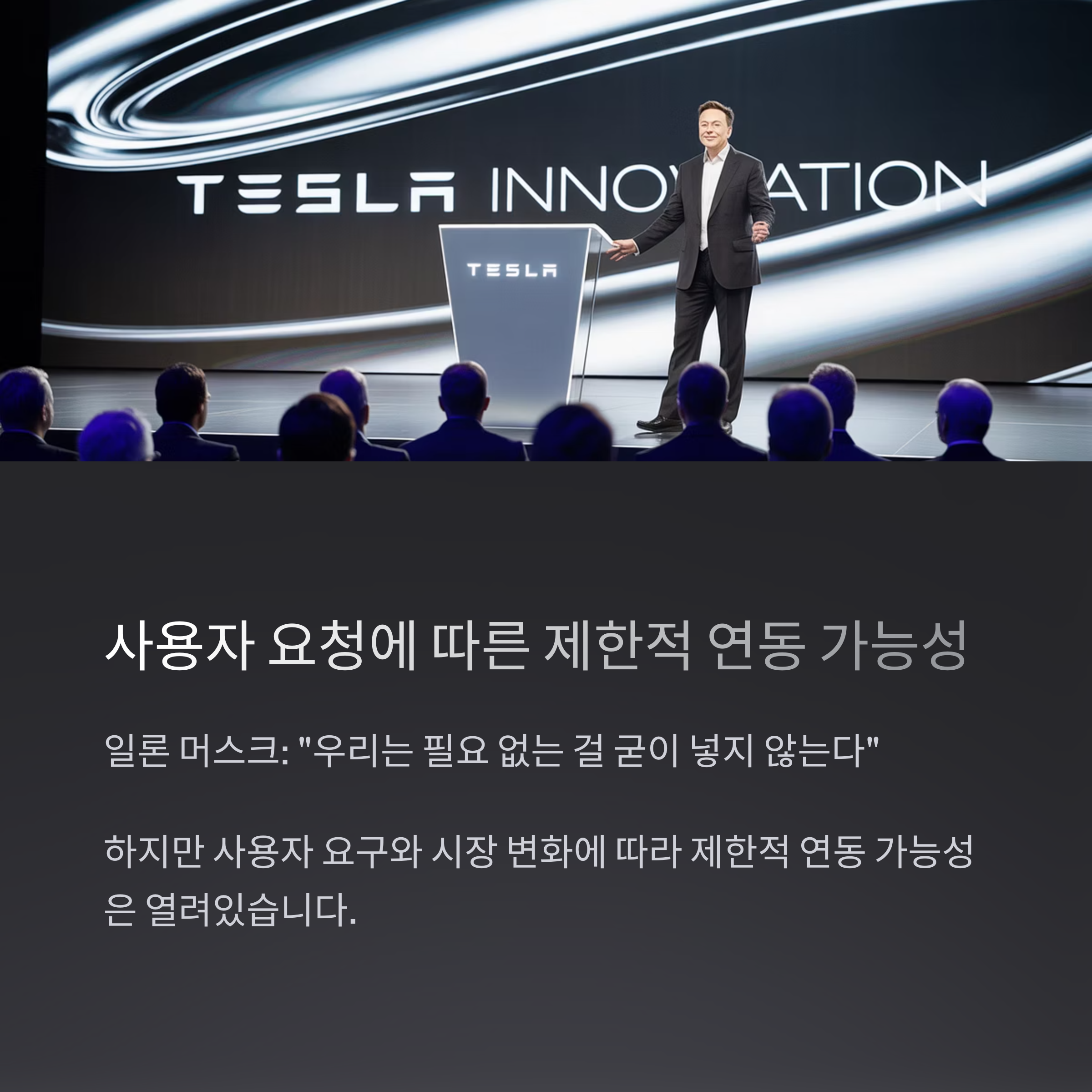 현재 구조상 테슬라가 카플레이·안드로이드 오토를 정식 탑재할 가능성은 낮지만