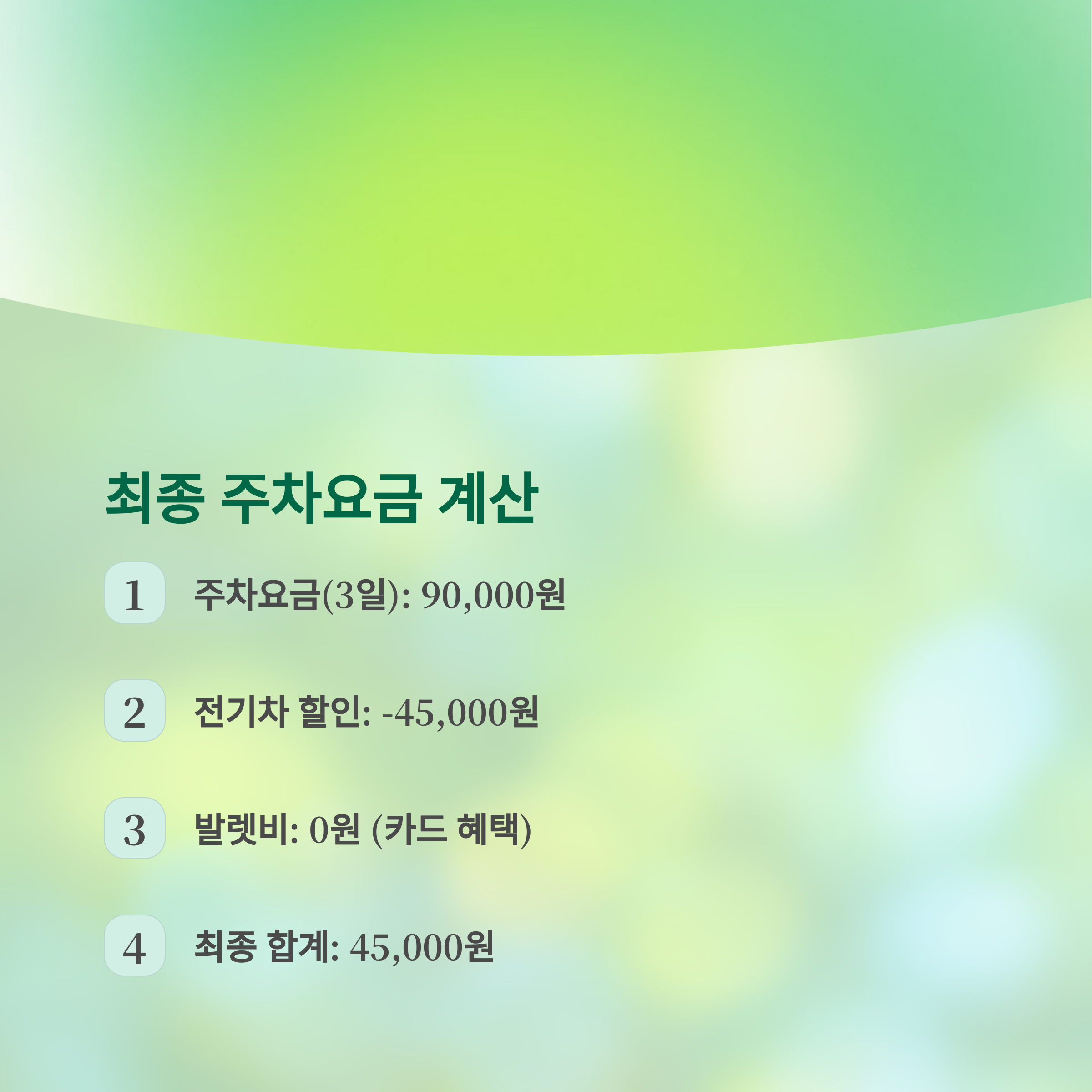 전기차 3일 주차 시 총 90,000원의 50%인 45,000원만 지불하면 됩니다.