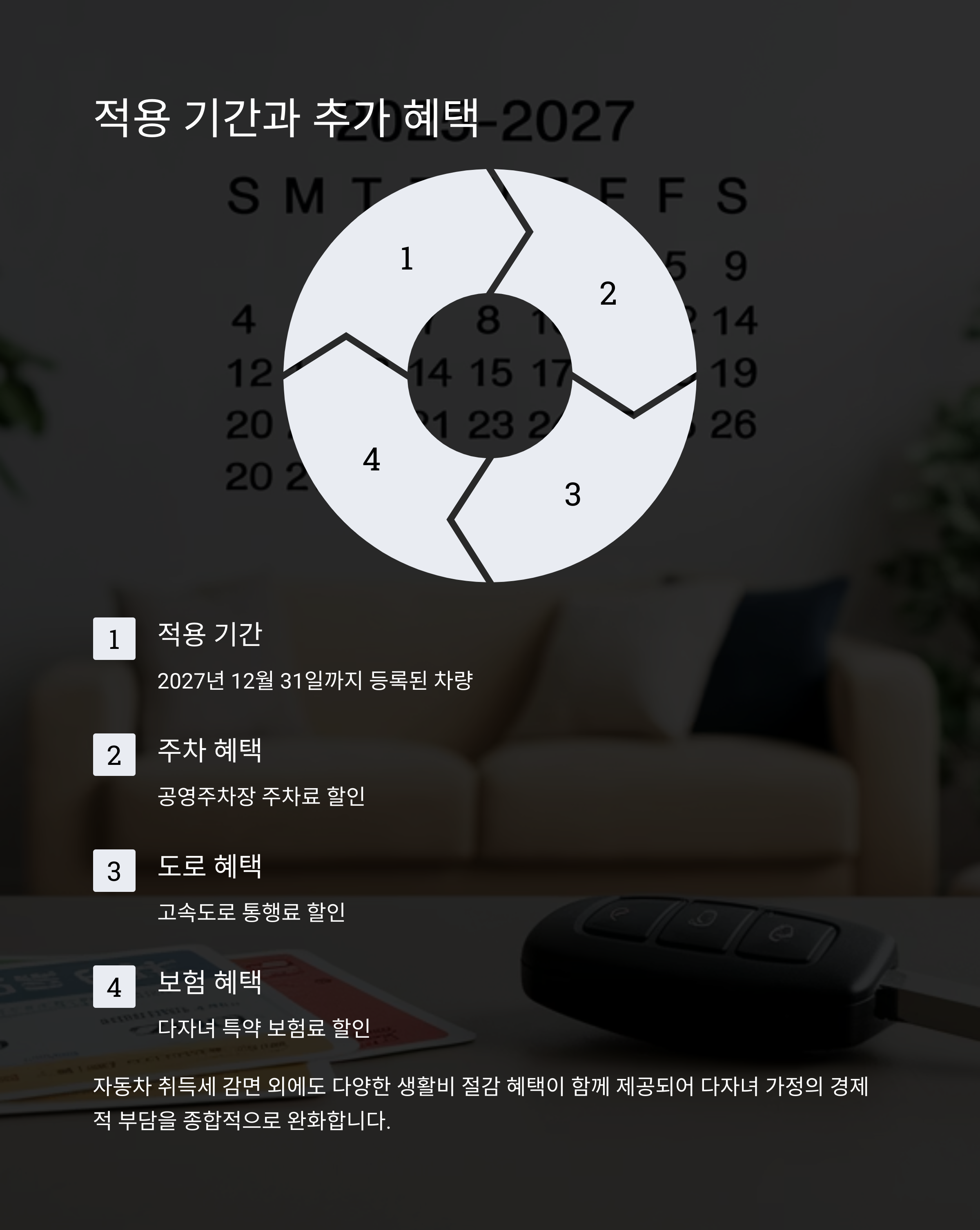 이번 정책은 단순 차량 세제 완화를 넘어, 공영주차장, 통행료 등 다각적 혜택을 통해 다자녀 가구의 실질적 생활비 절감도 목표로 삼습니다.