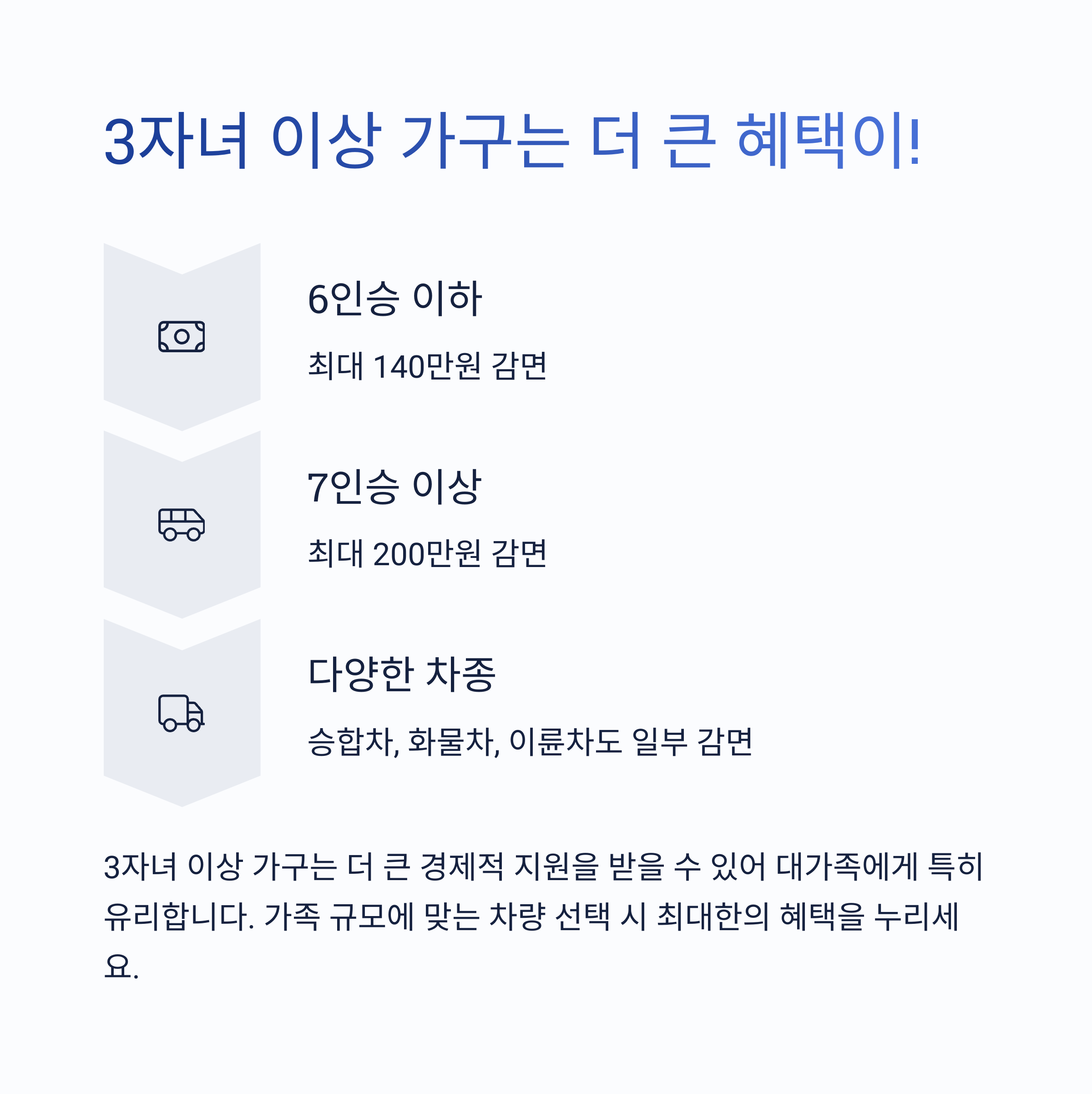 | 3자녀 이상 가구 | 6인승 이하: 100% 감면 (최대 140만원) |