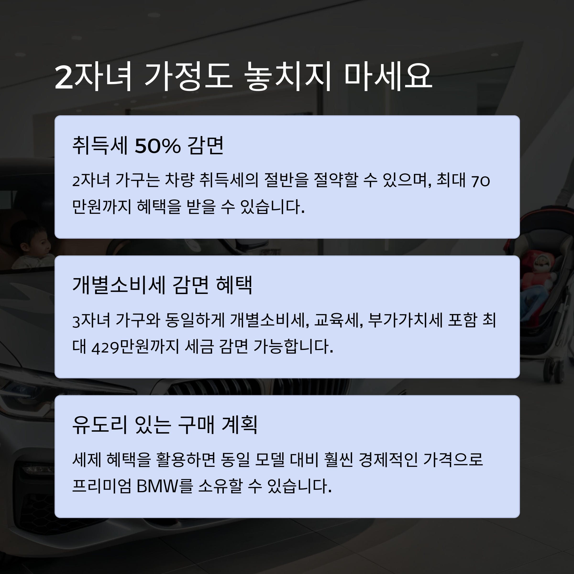 다자녀 가구는 국가에서 지원하는 다양한 세금 혜택을 누릴 자격이 있습니다. BMW와 같은 고급차 구매 시에도 이러한 혜택을 충분히 활용하면 부담을 줄일 수 있습니다.