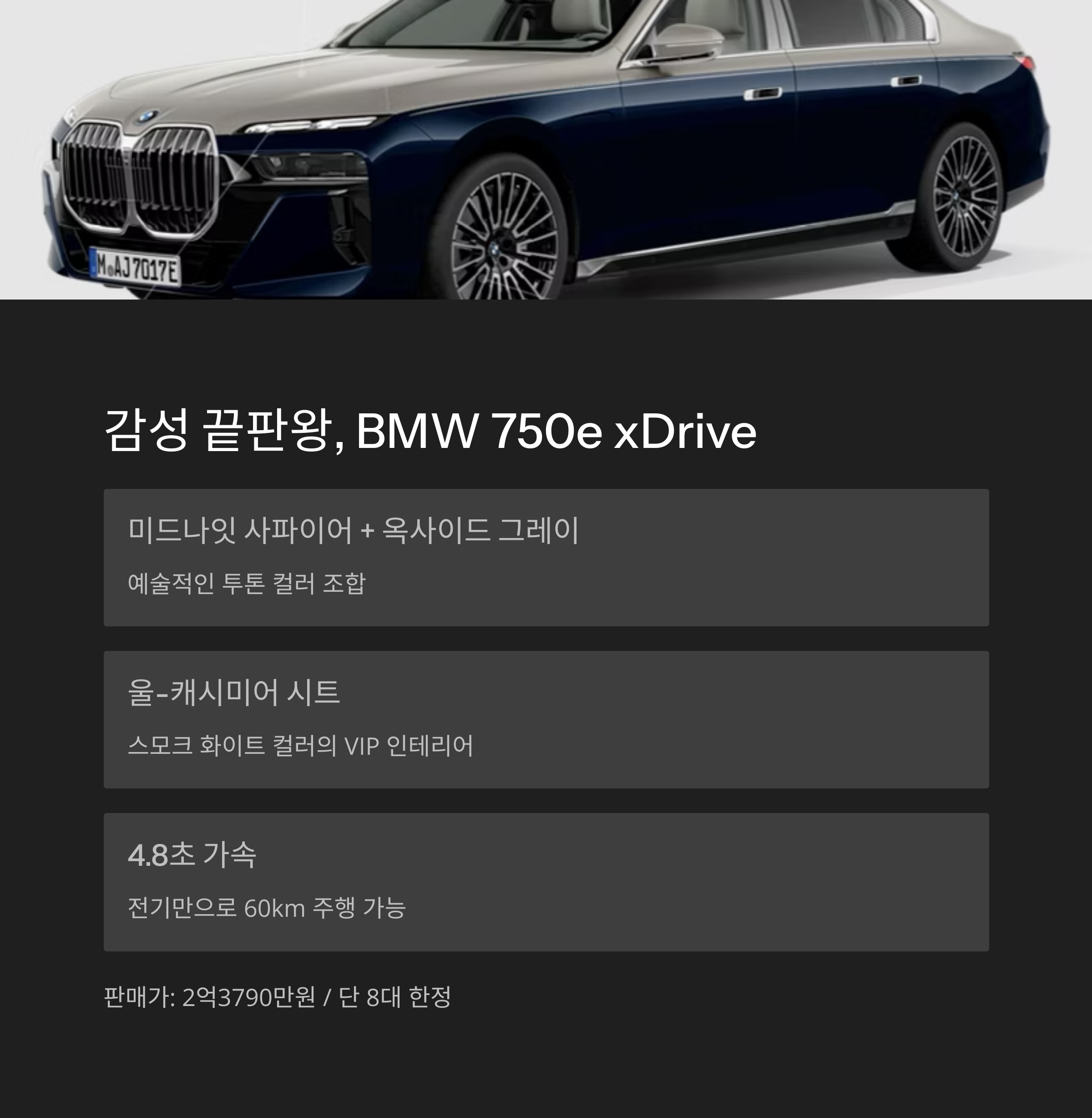 | 750e xDrive | 울-캐시미어 시트 + 투톤 컬러 | 489 | 4.8초 | 8대 | 2억3790만원 |