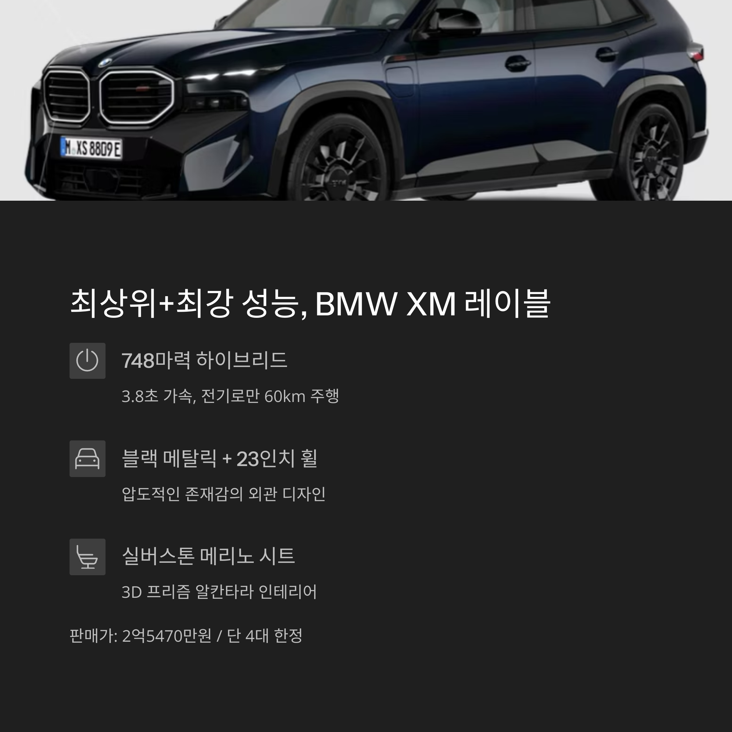 | XM | 748마력 끝판왕 + 라운지급 인테리어 | 748 | 3.8초 | 4대 | 2억5470만원 |