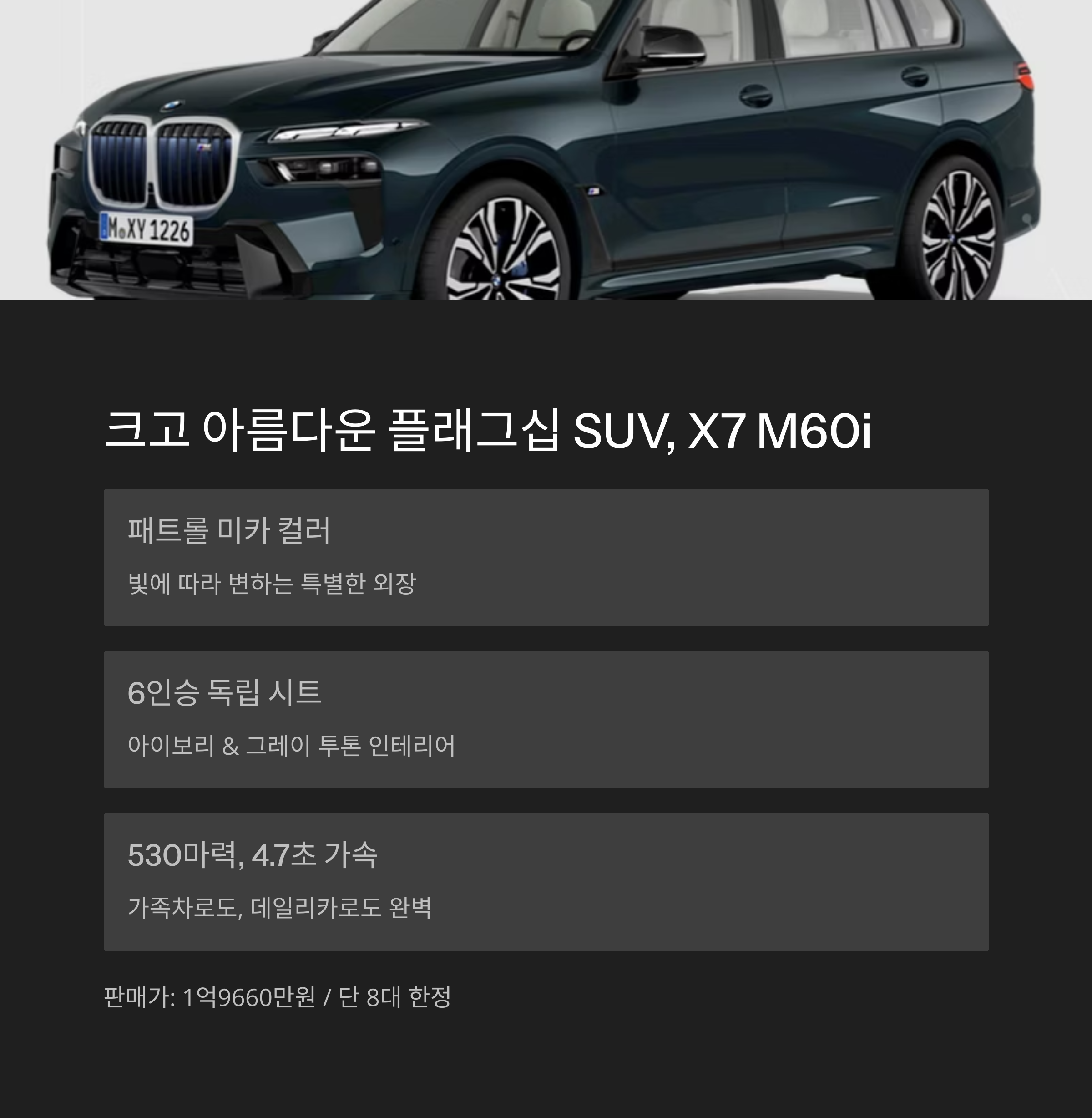 | X7 M60i | 6인승 독립시트 + 패트롤 미카 | 530 | 4.7초 | 8대 | 1억9660만원 |