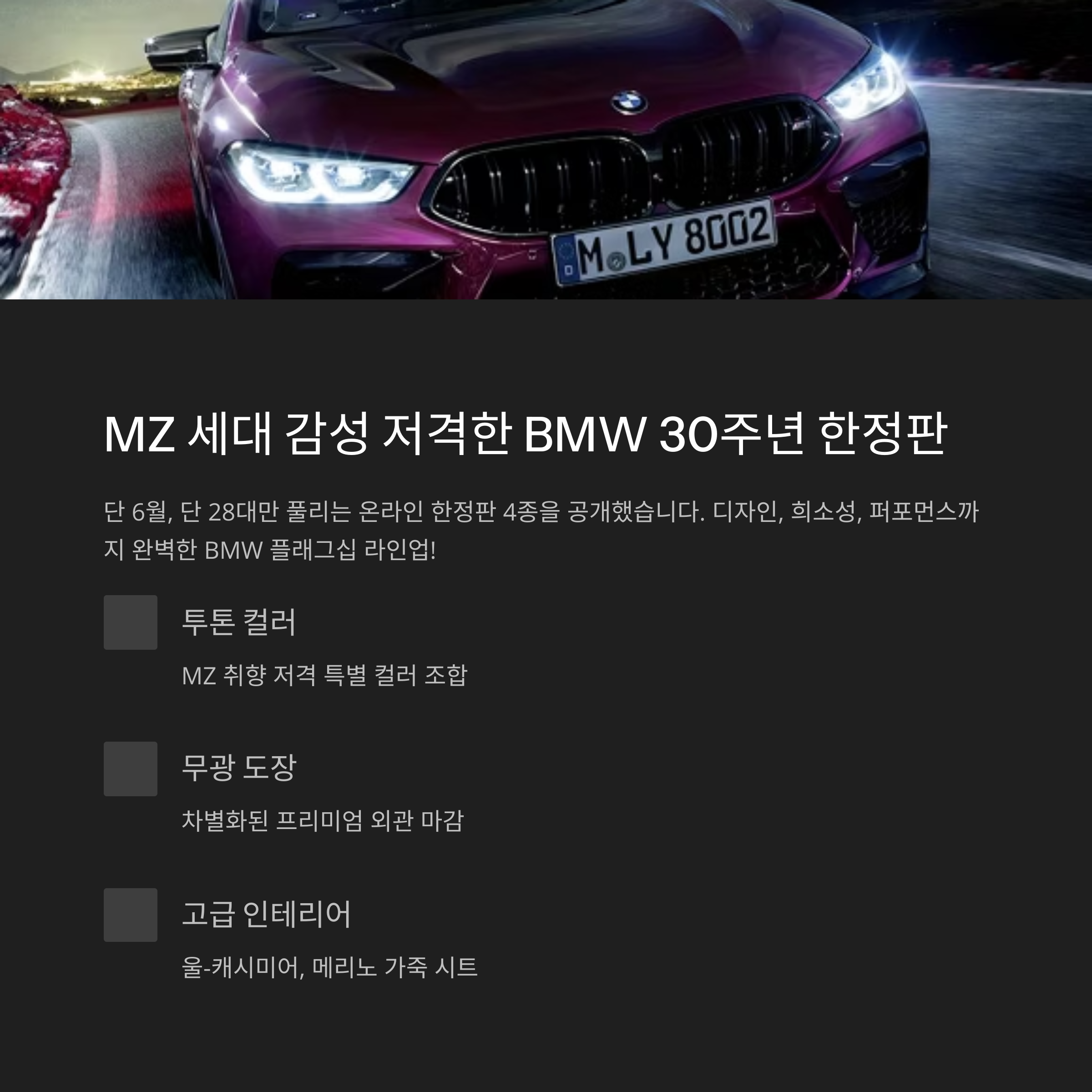 BMW 30주년 기념이라 수량은 역대급 소량, 컬러랑 내장도 MZ 감성 딱입니다.