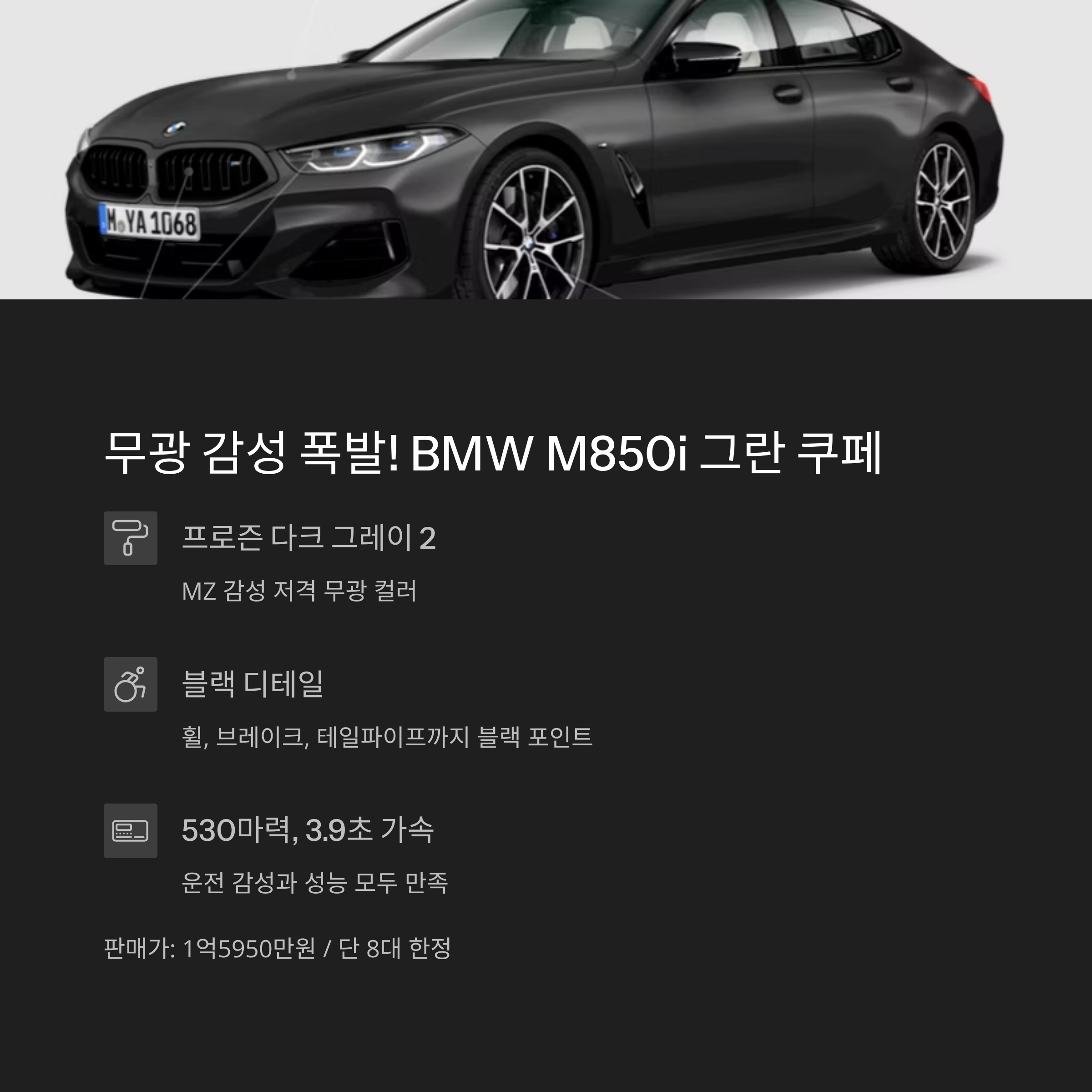 | M850i GC | 무광 다크그레이 + 블랙 퍼포먼스 | 530 | 3.9초 | 8대 | 1억5950만원 |