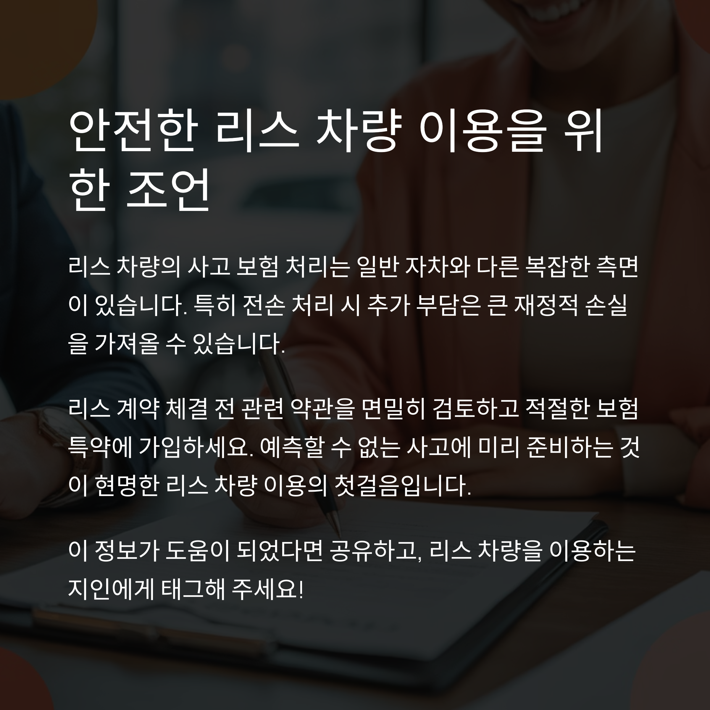 - 리스 계약서 정독: 리스 계약서에는 사고 발생 시 보험 처리 관련 내용, 특히 전손 시 고객의 책임 범위 및 중도 해지 수수료 등에 대한 명확한 조항이 포함되어 있습니다. 계약 전 반드시 꼼꼼히 확인해야 합니다.