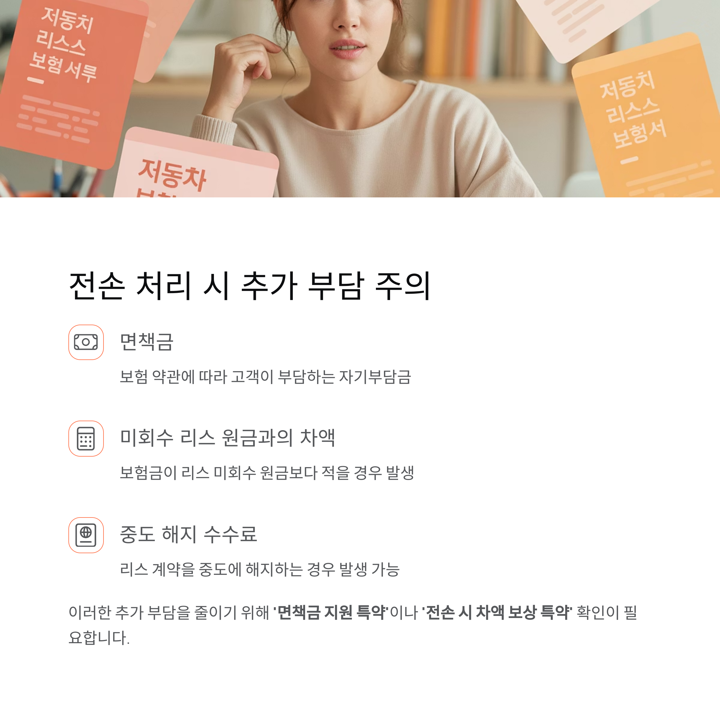 이러한 추가 부담을 줄이기 위해 일부 리스 상품에는 '면책금 지원 특약'이나 '전손 시 차액 보상 특약'과 같은 특약이 포함되어 있기도 합니다. 리스 계약 시 이러한 특약의 유무를 반드시 확인해야 합니다.