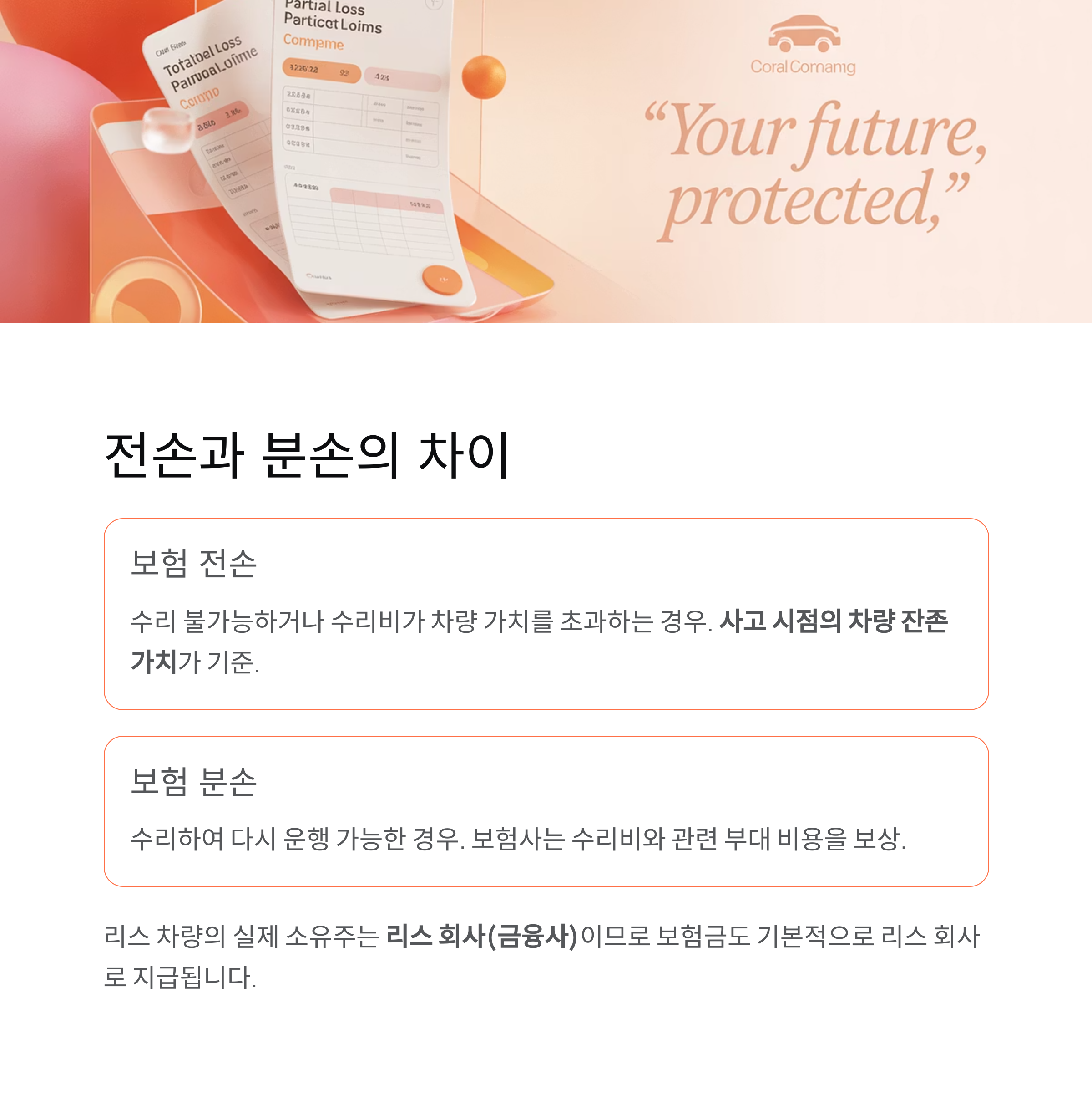 - 보험 전손(Total Loss): 차량의 손상이 너무 심해 수리가 불가능하거나, 수리 비용이 차량의 가치(보험 가입 금액)를 초과하는 경우를 말합니다. 이 경우 보험사는 차량 가액 전체를 보상하고, 해당 차량은 보험사의 소유가 됩니다. 리스 차량의 경우, 이 '차량 가치'는 리스 회사가 차량을 취득했을 때의 가액이 아닌, 사고 발생 시점의 차량 잔존 가치를 기준으로 합니다.
