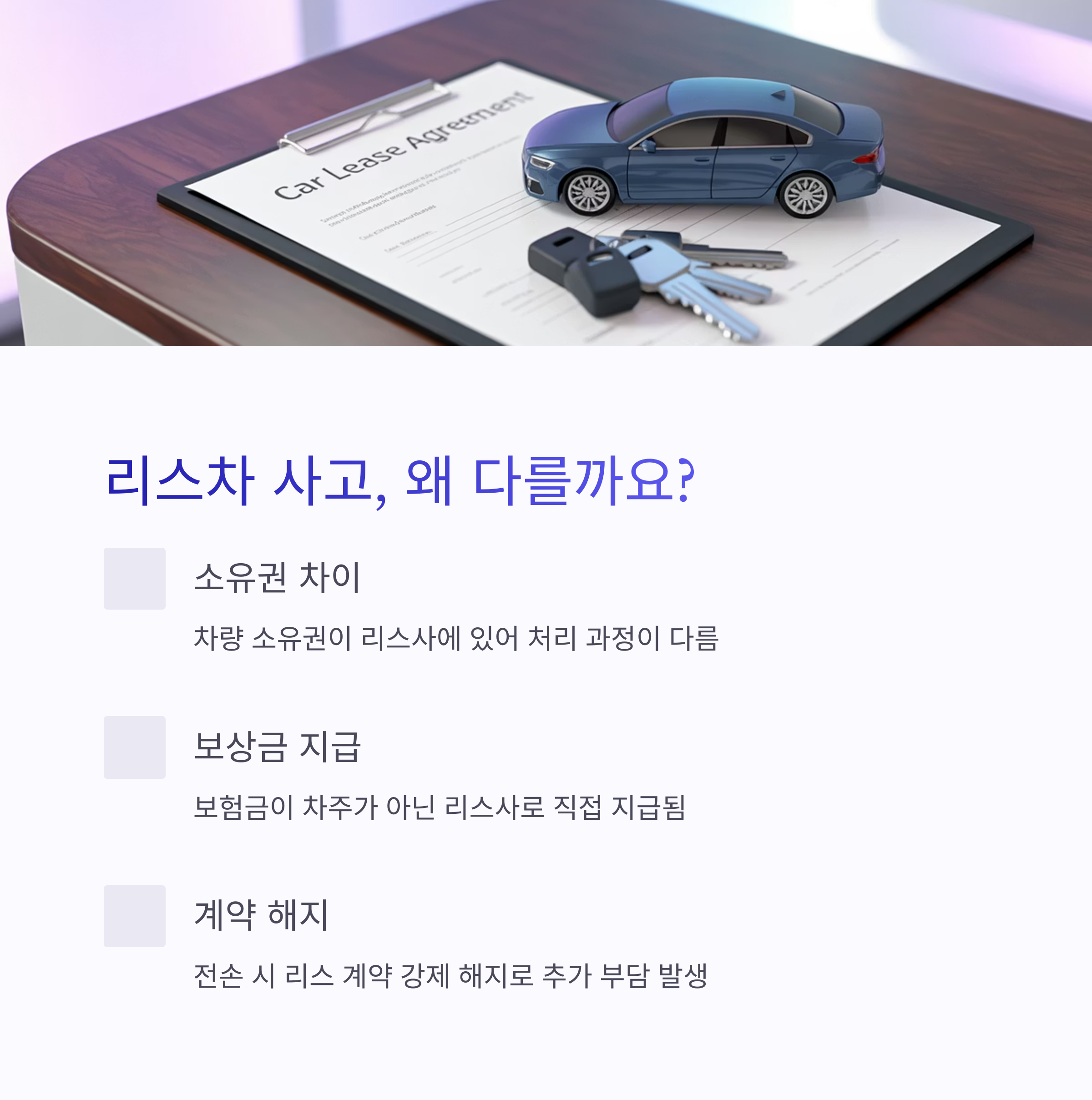 리스 차량은 차량 소유권이 리스사에 있으므로, 사고 발생 시 처리 과정이 일반 자차와 다릅니다