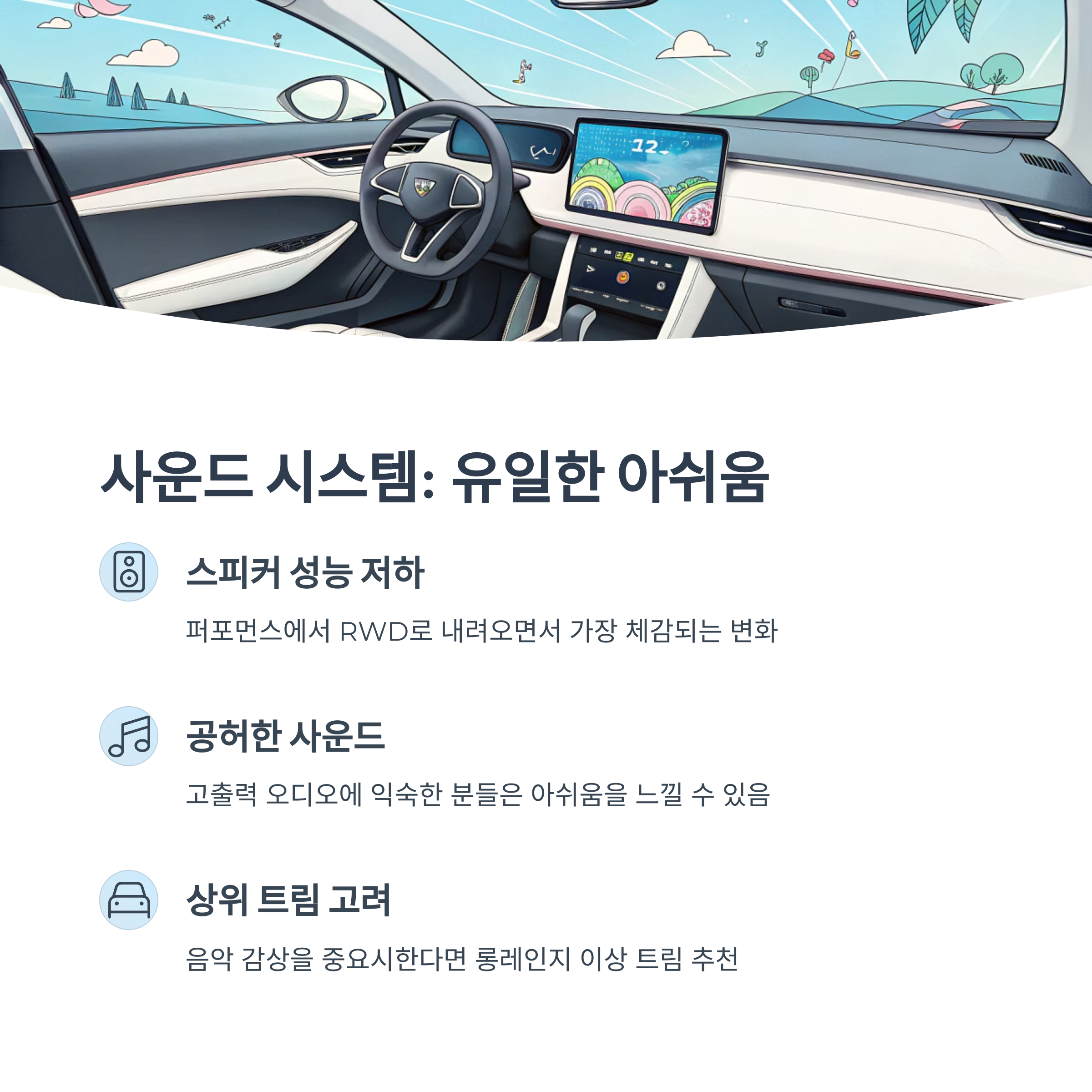 퍼포먼스 트림에서 RWD로 내려오면서 가장 체감되는 변화는 바로 스피커 성능 저하입니다. 고출력 오디오에 익숙해진 분들이라면 주니퍼 RWD의 사운드는 다소 공허하게 느껴질 수 있습니다.
