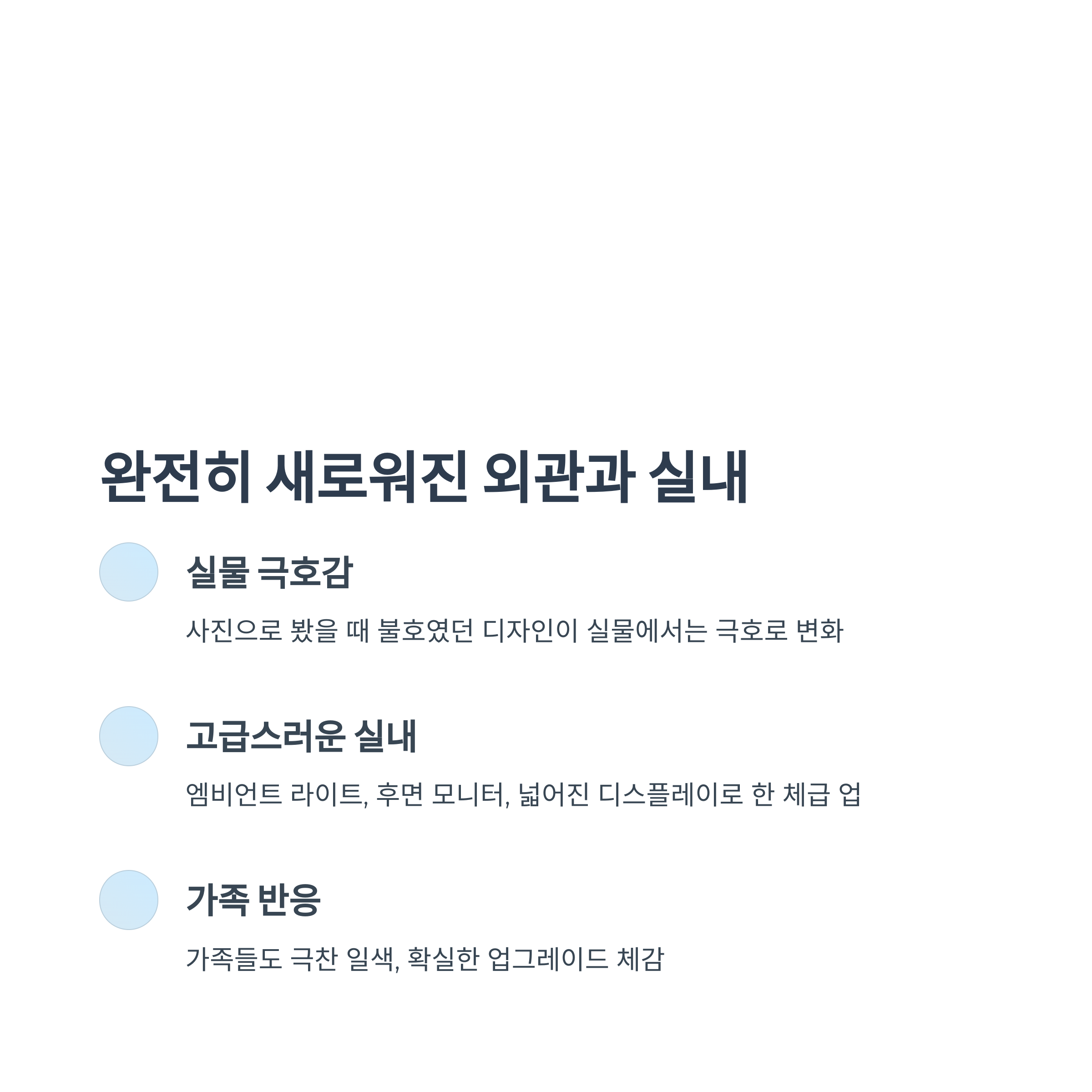 실내도 마찬가지입니다. 엠비언트 라이트, 후면 모니터, 그리고 넓어진 디스플레이까지 더해져 한 체급 위 차량처럼 느껴집니다. 가족들 반응도 극찬 일색이었다는 점은 눈여겨볼 만합니다.