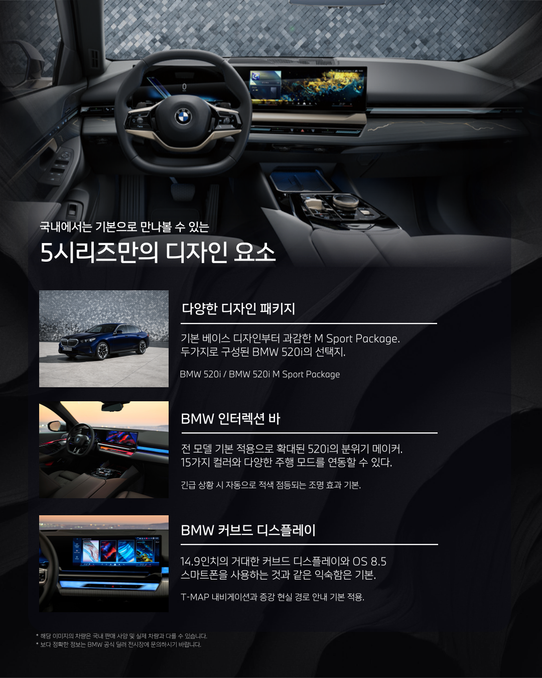 BMW 520i는 Base와 M Sport 두 가지 디자인 패키지를 제공합니다.