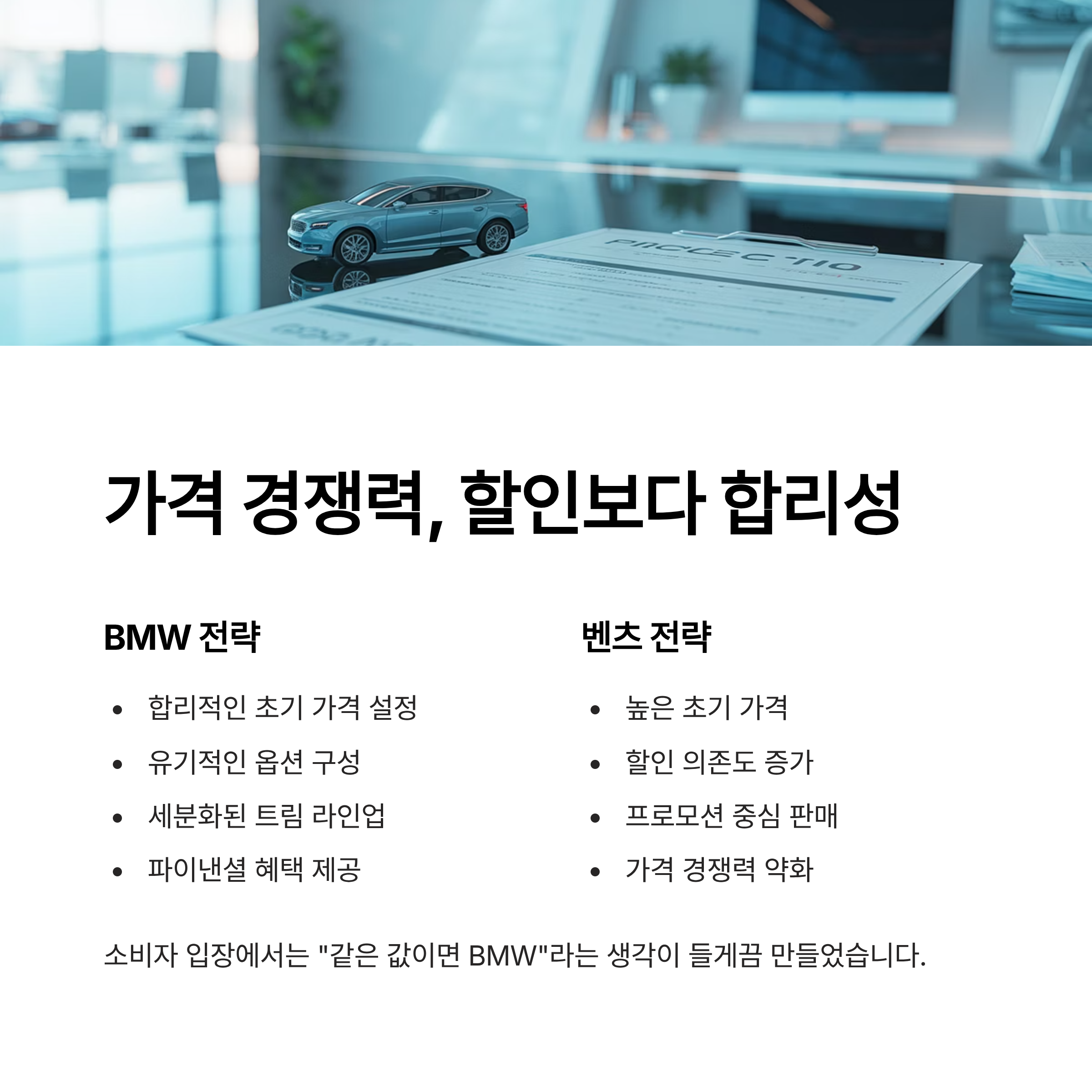 벤츠가 최근 할인에 의존하고 있다면, BMW는 ‘초기 가격 설정’ 자체를 합리적으로 구성하는 전략을 취했습니다. 옵션 구성, 트림 세분화, 파이낸셜 혜택 등이 유기적으로 연결되면서 소비자 입장에서는 "같은 값이면 BMW"라는 생각이 들게끔 만들었습니다.