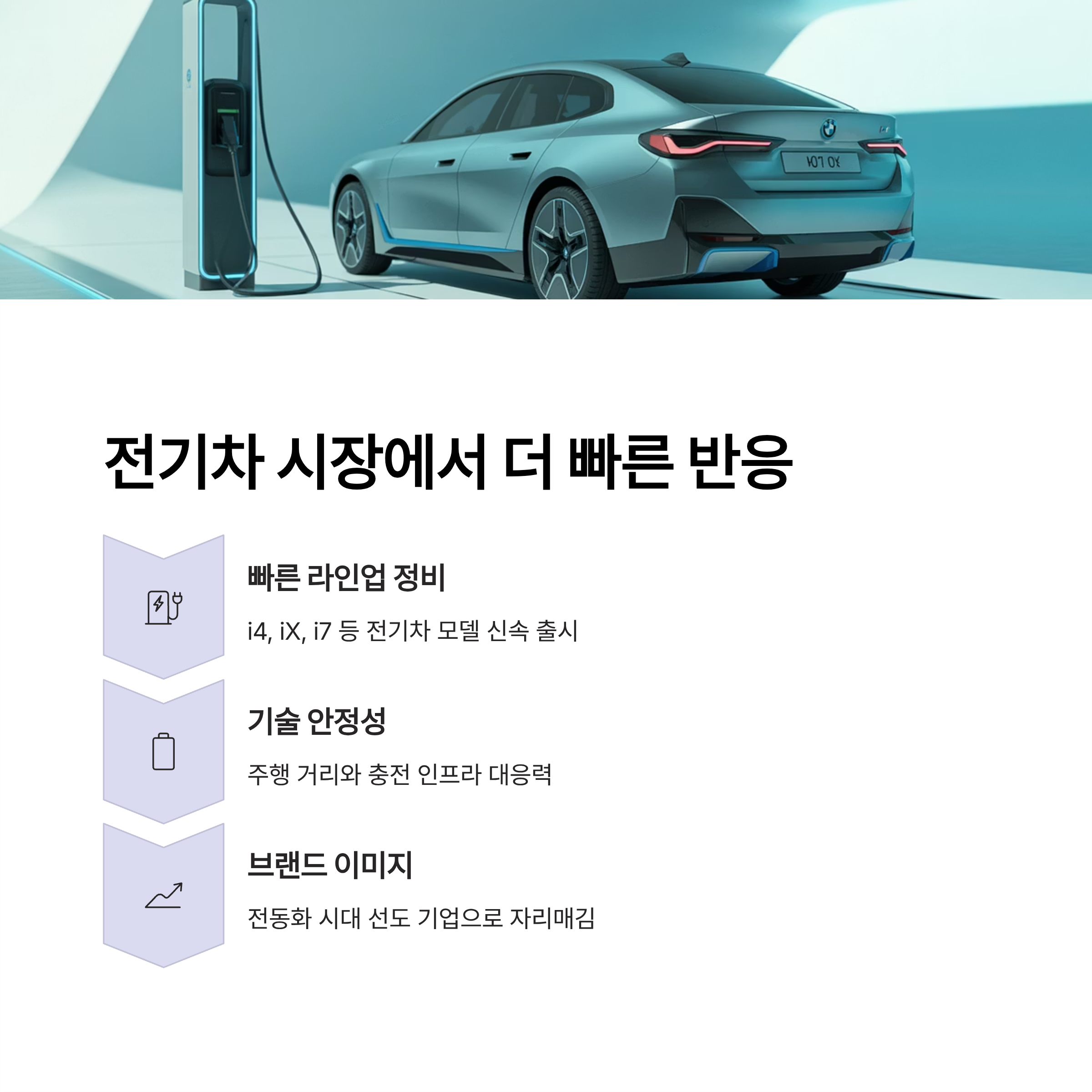 BMW는 전기차 전환 속도에서도 벤츠보다 한발 빠릅니다. i4, iX, i7 등 라인업을 발 빠르게 정비했고, 기술 안정성과 주행 거리, 충전 인프라에 대한 대응도 빠릅니다. 이는 전동화 시대에 브랜드 이미지 개선에 큰 도움이 되었습니다.