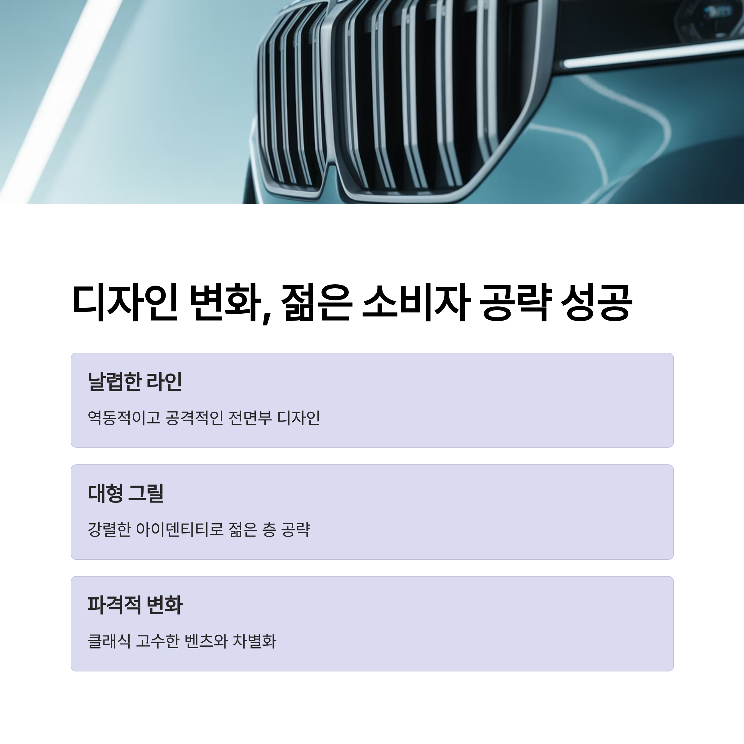 BMW는 최근 몇 년간 과감한 디자인 변화로 주목을 받았습니다. 날렵하고 역동적인 라인, 대형 그릴을 중심으로 한 공격적인 전면부는 젊은 소비자층에게 강하게 어필하고 있죠. 벤츠가 클래식한 디자인에서 큰 변화를 주지 않은 반면, BMW는 ‘파격’을 택했고 그 전략이 통한 셈입니다.