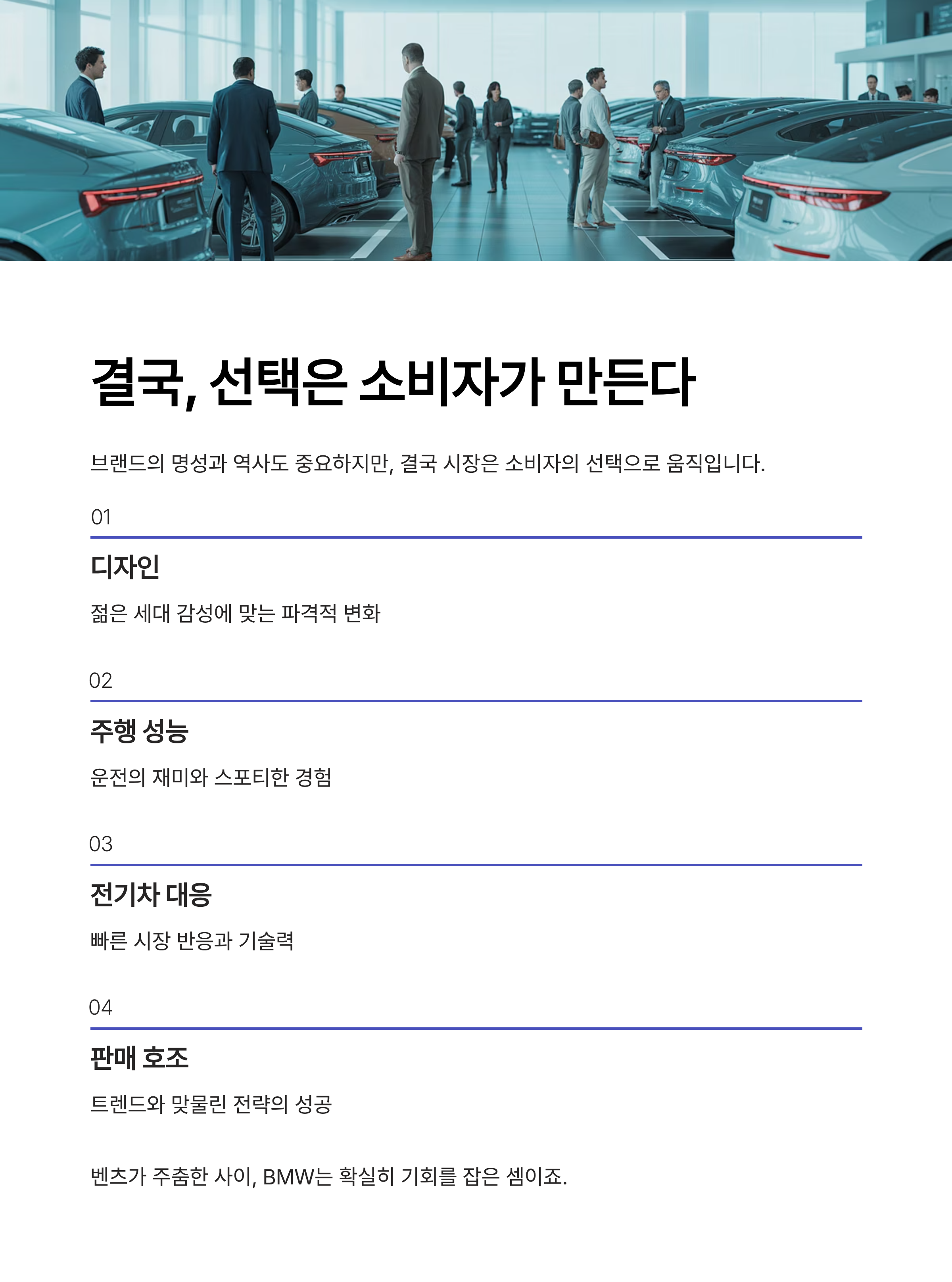 브랜드의 명성과 역사도 중요하지만, 결국 시장은 소비자의 선택으로 움직입니다. BMW는 디자인, 주행 성능, 전기차 대응력 등 다양한 요소에서 젊은 세대와 트렌드에 더 잘 맞물리고 있으며, 이 점이 판매 호조로 이어지고 있습니다.