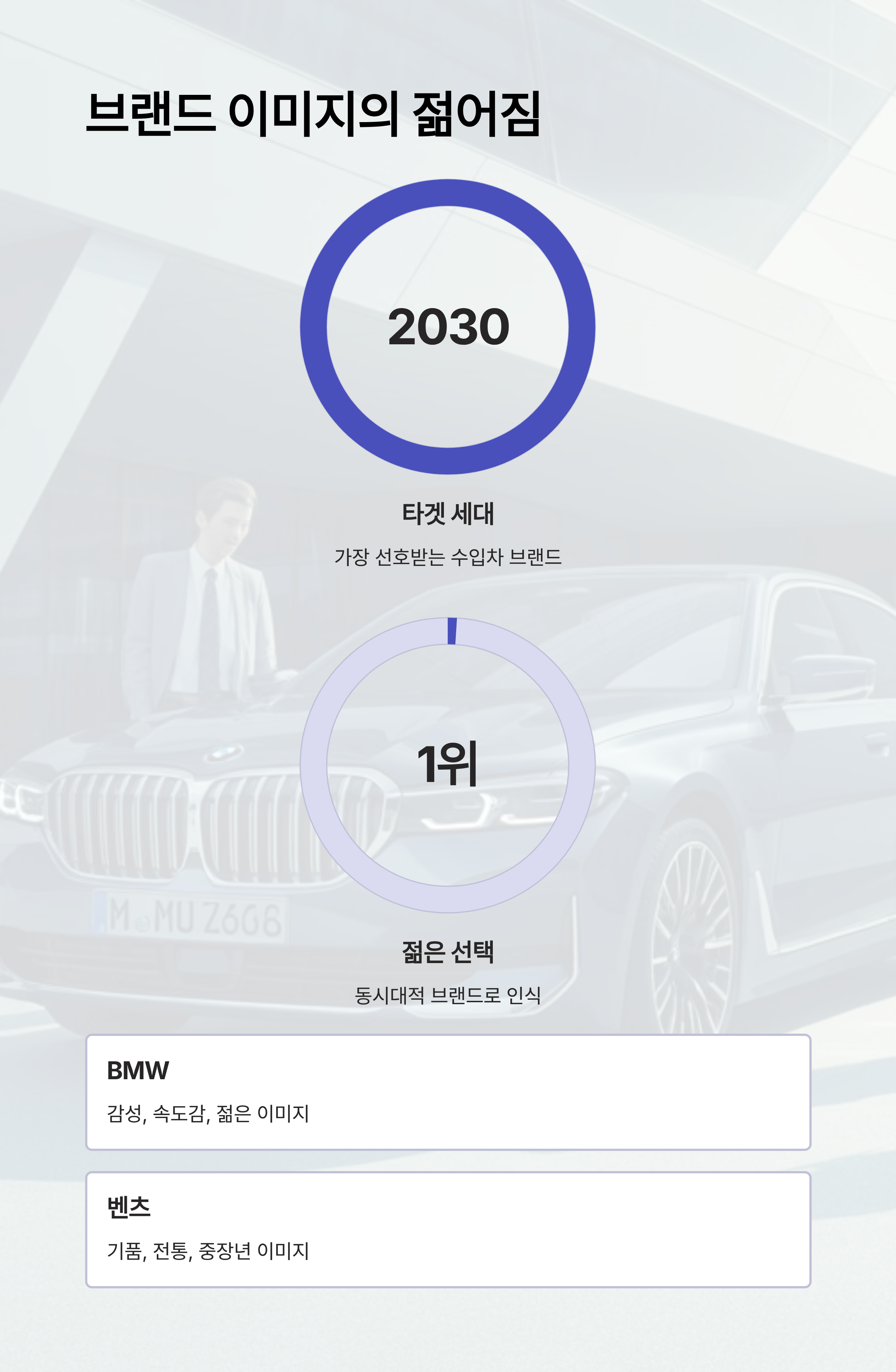 BMW는 최근 2030세대에게 가장 선호받는 수입차 브랜드로 자리를 잡았습니다. ‘기품’보다 ‘감성’을, ‘전통’보다 ‘속도감’을 원하는 젊은 세대에게 BMW는 더 동시대적인 브랜드로 인식되고 있죠. 반면 벤츠는 여전히 중장년 이미지가 강하다는 의견이 많습니다.