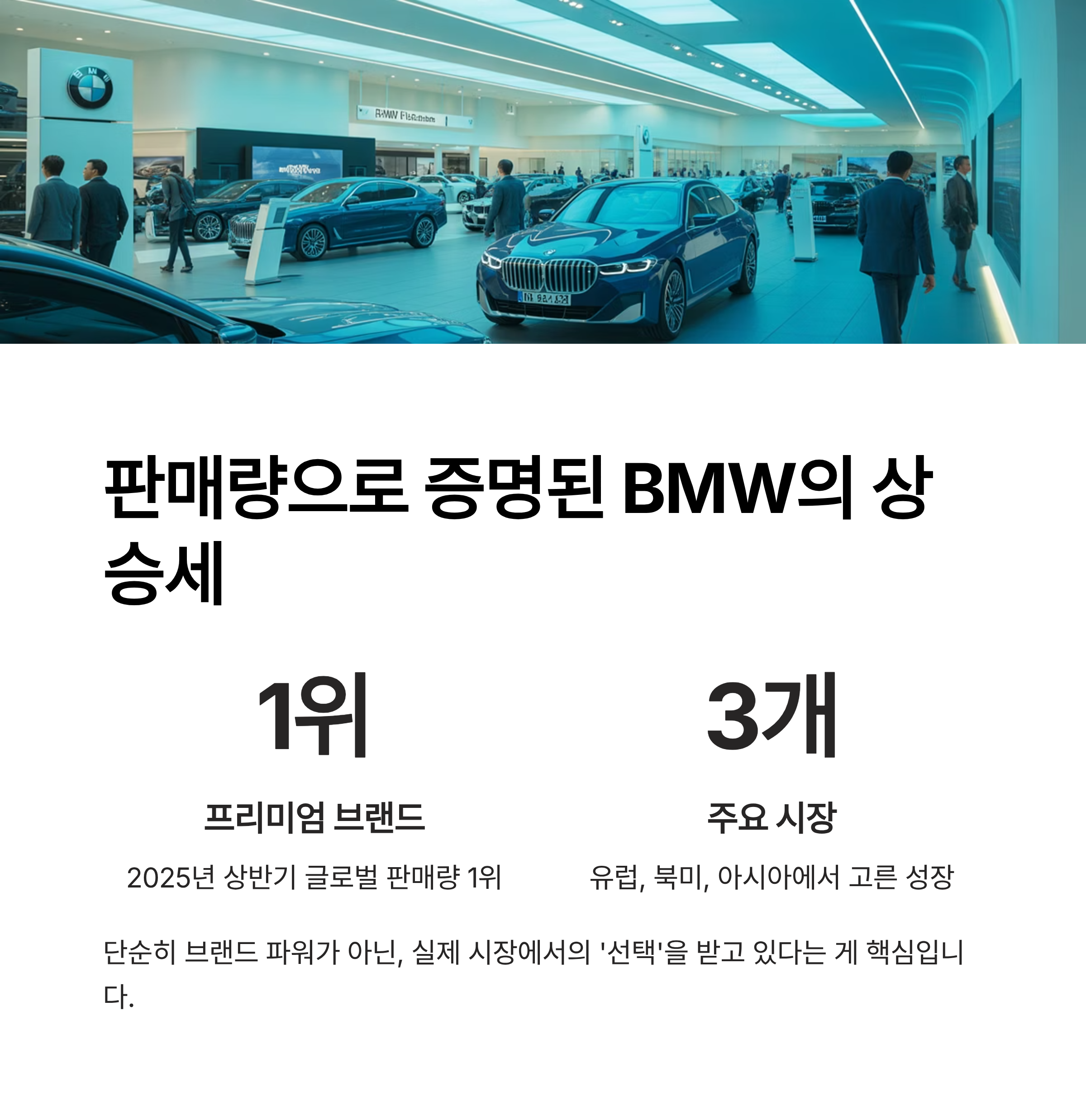 BMW는 2025년 상반기 기준 글로벌 판매량에서 벤츠를 앞지르며 프리미엄 브랜드 1위 자리를 굳건히 지키고 있습니다. 특히 유럽, 북미, 아시아 시장에서 고른 성장을 보여주며 브랜드 경쟁력을 입증했습니다.