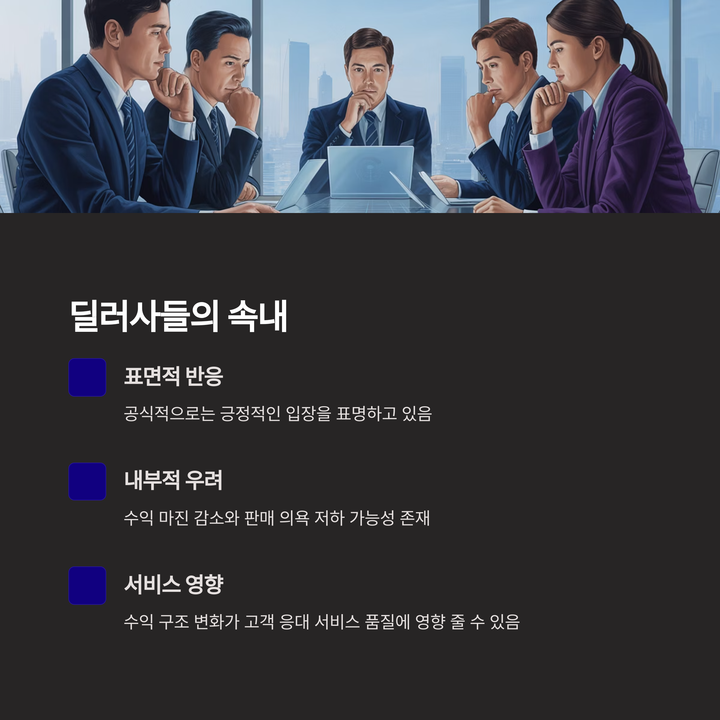 이는 딜러들의 판매 의욕 저하로 이어질 수 있고, 고객 응대 서비스에 영향을 줄 여지도 있습니다.