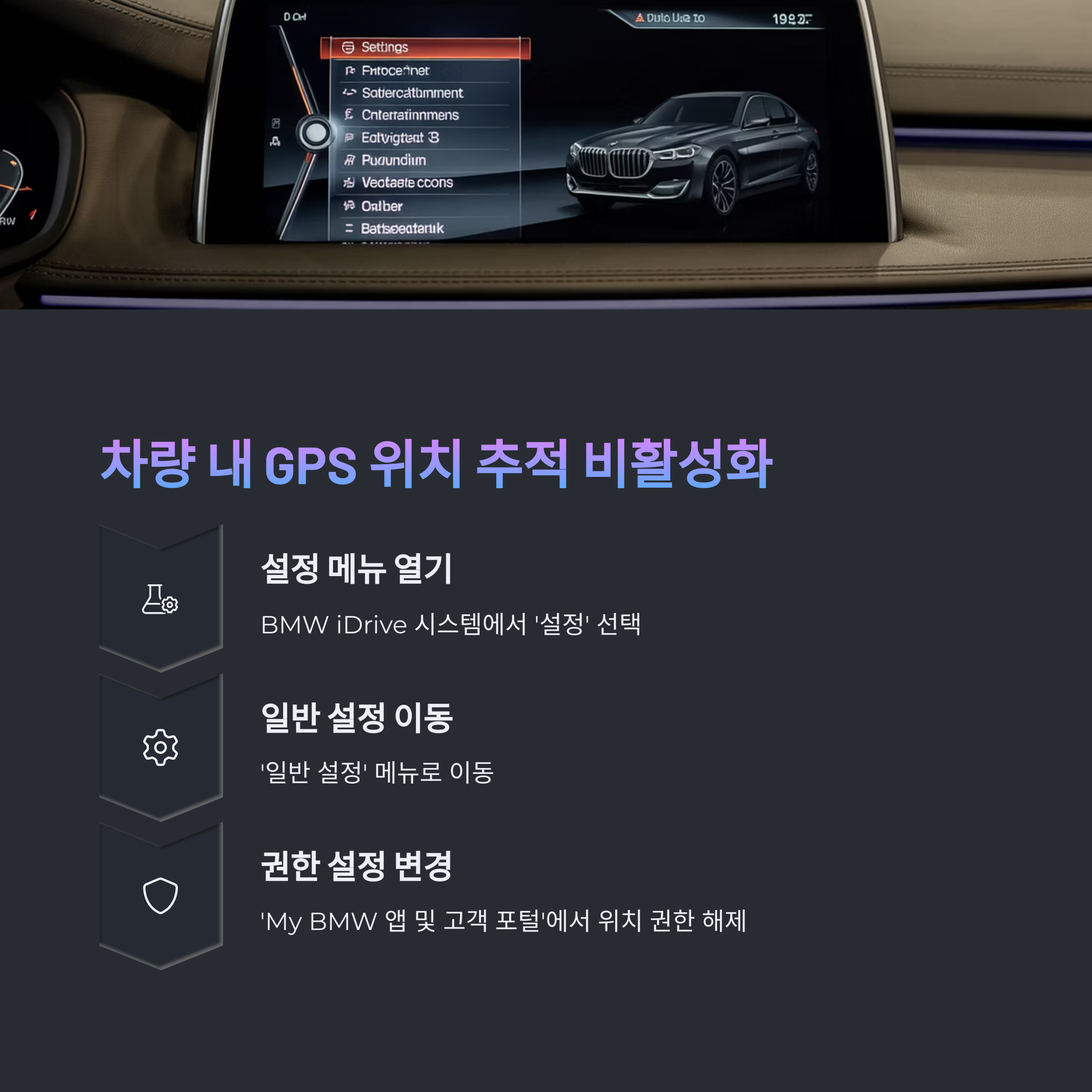 | 3단계 | iDrive에서 GPS 위치 공유 해제 | 차량 내 설정 메뉴 |
