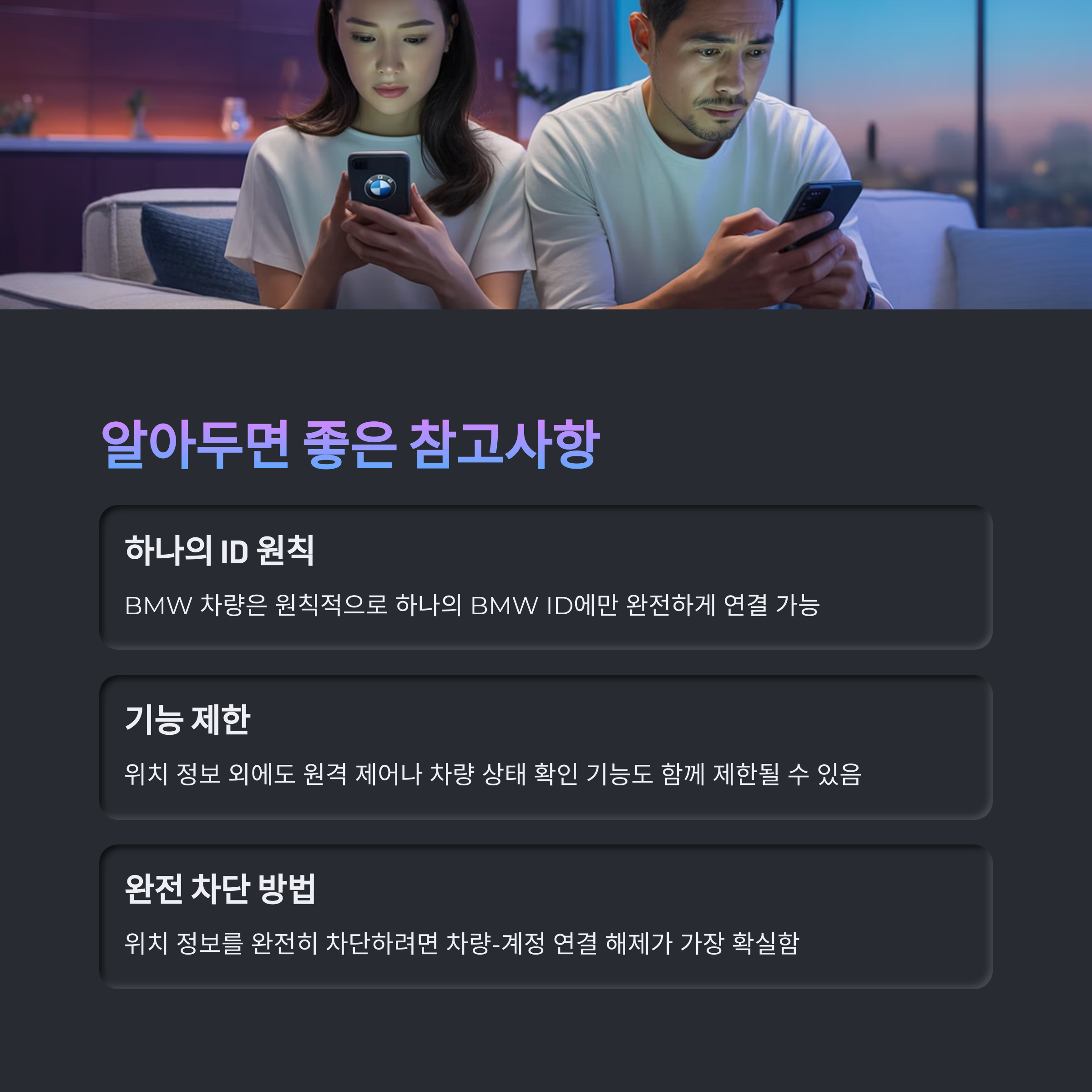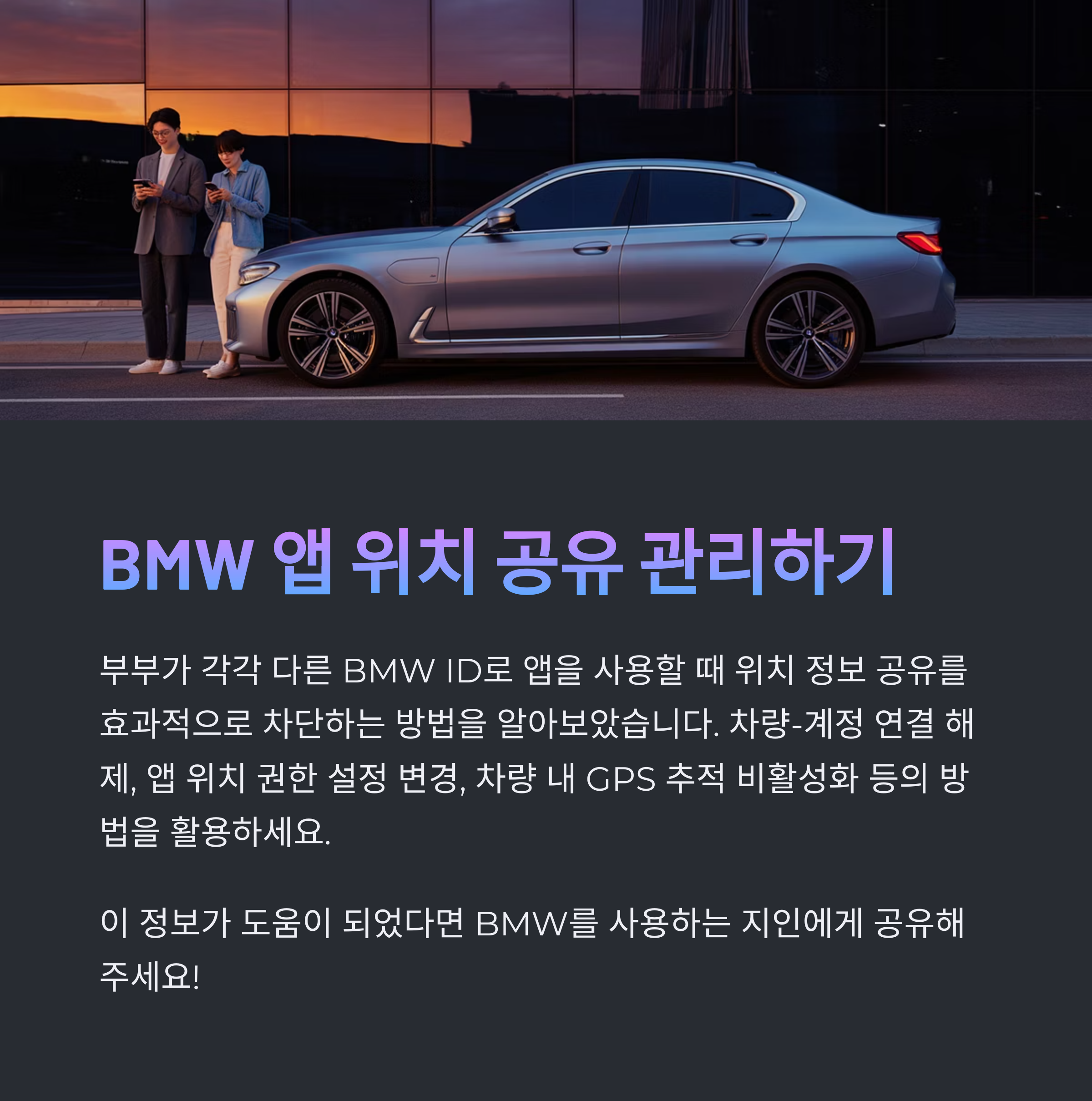 BMW 차량을 부부가 따로 관리하고 싶을 때, 위치 정보 공유는 사생활 보호 측면에서 민감한 요소가 됩니다.