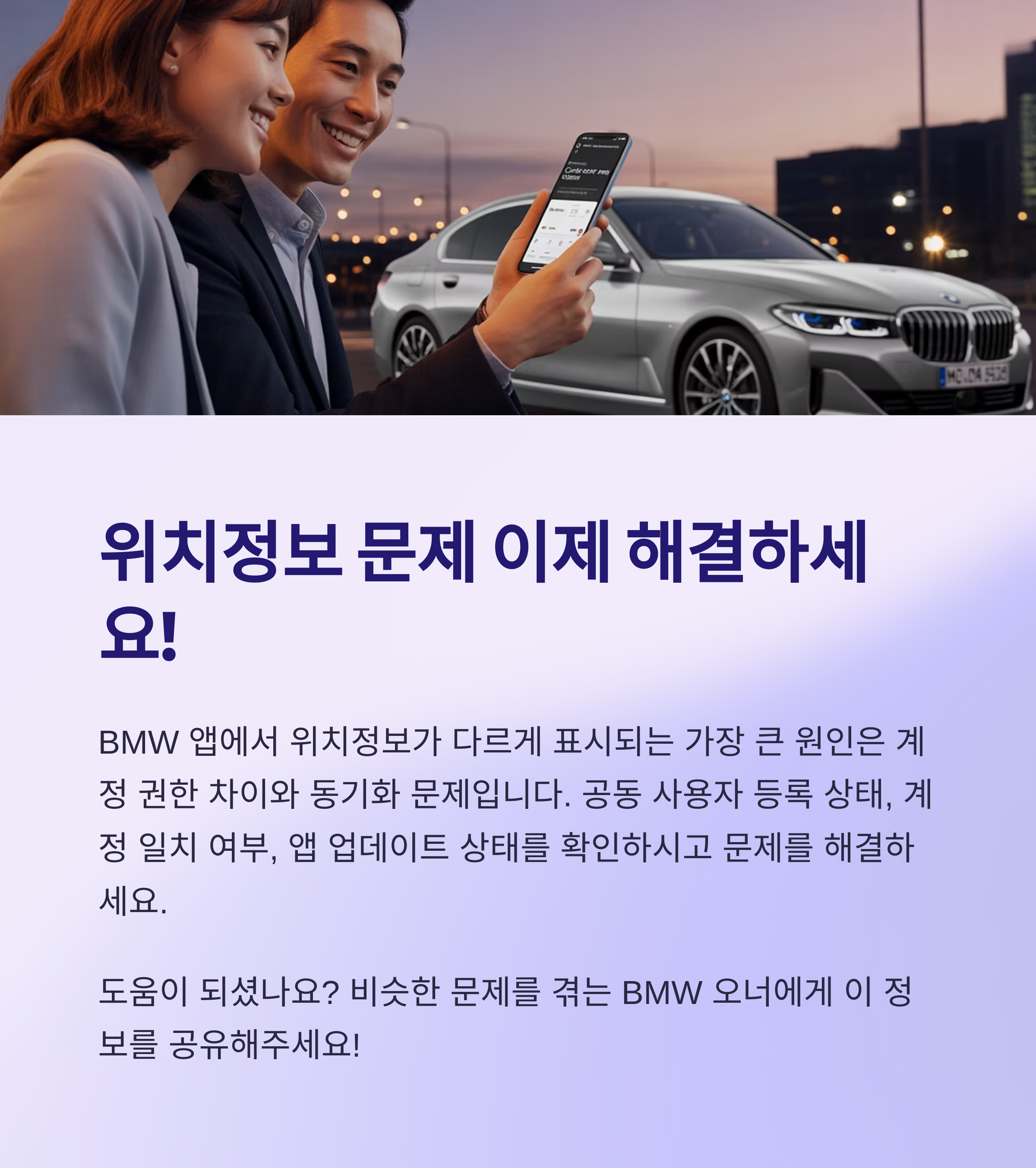 부부가 같은 BMW 차량을 함께 사용하면서 각자 다른 스마트폰으로 My BMW 앱을 이용할 때, 차량의 현재 위치가 서로 다르게 표시되는 현상을 겪는 경우가 있습니다. 이는 단순한 GPS 오류가 아니라 앱 계정 연동 방식, 동기화 문제, 설정 오류 등이 복합적으로 작용하는 결과입니다. 본 글에서는 이 문제의 주요 원인과 해결 방법을 정리해드립니다.