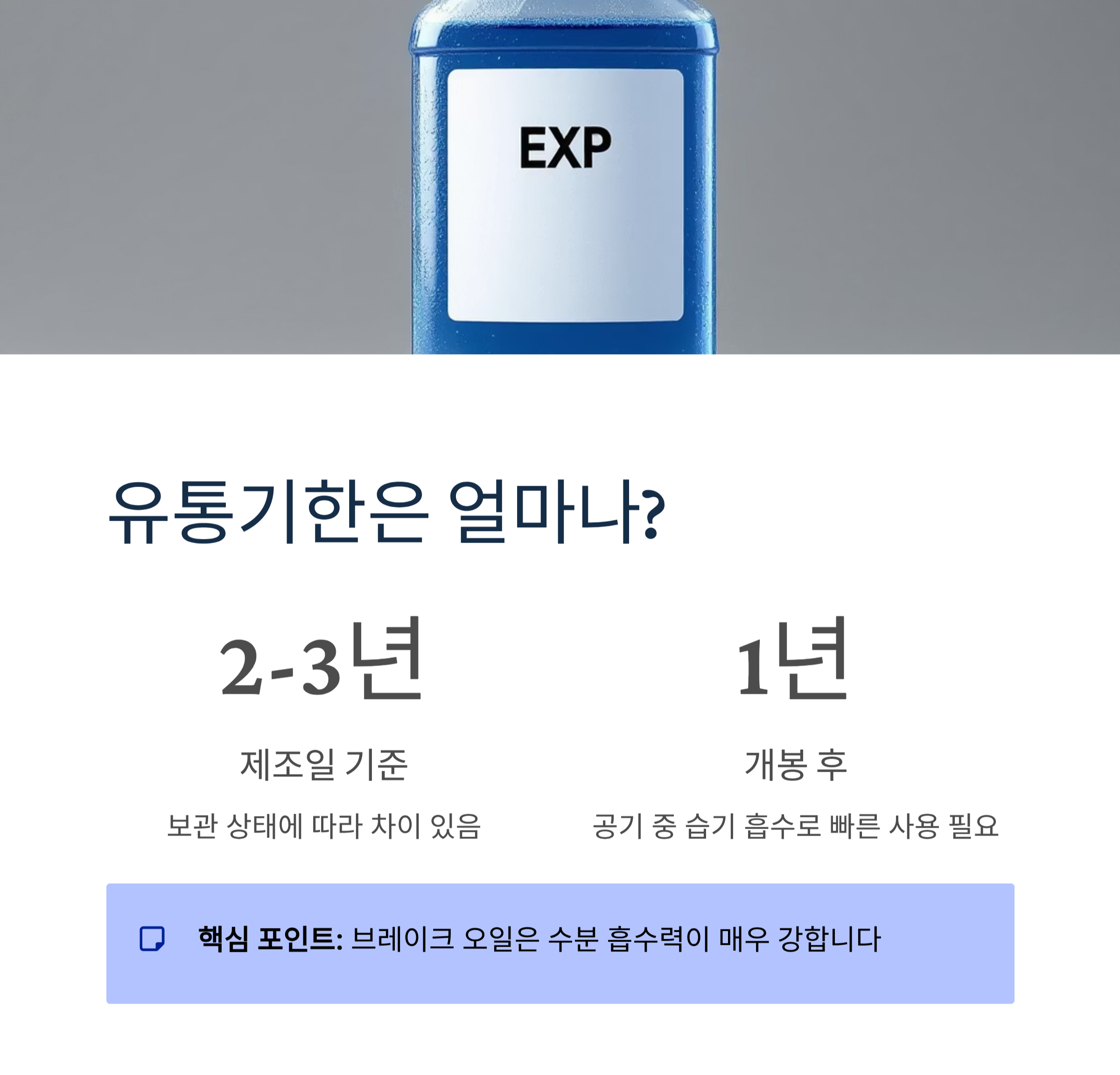브레이크 오일은 차량의 안전과 직결되는 중요한 소모품입니다. 하지만 많은 운전자들이 브레이크 오일에도 유통기한이 있다는 사실을 모르고 지나치는 경우가 많죠. 겉보기에 멀쩡해 보여도, 시간이 지나면 그 기능은 눈에 띄지 않게 떨어지기 시작합니다. 오늘은 브레이크 오일의 유통기한과 이를 무시했을 때 생기는 문제점들을 낱낱이 알려드릴게요. 한마디로, 이건 그냥 넘길 일이 아닙니다.