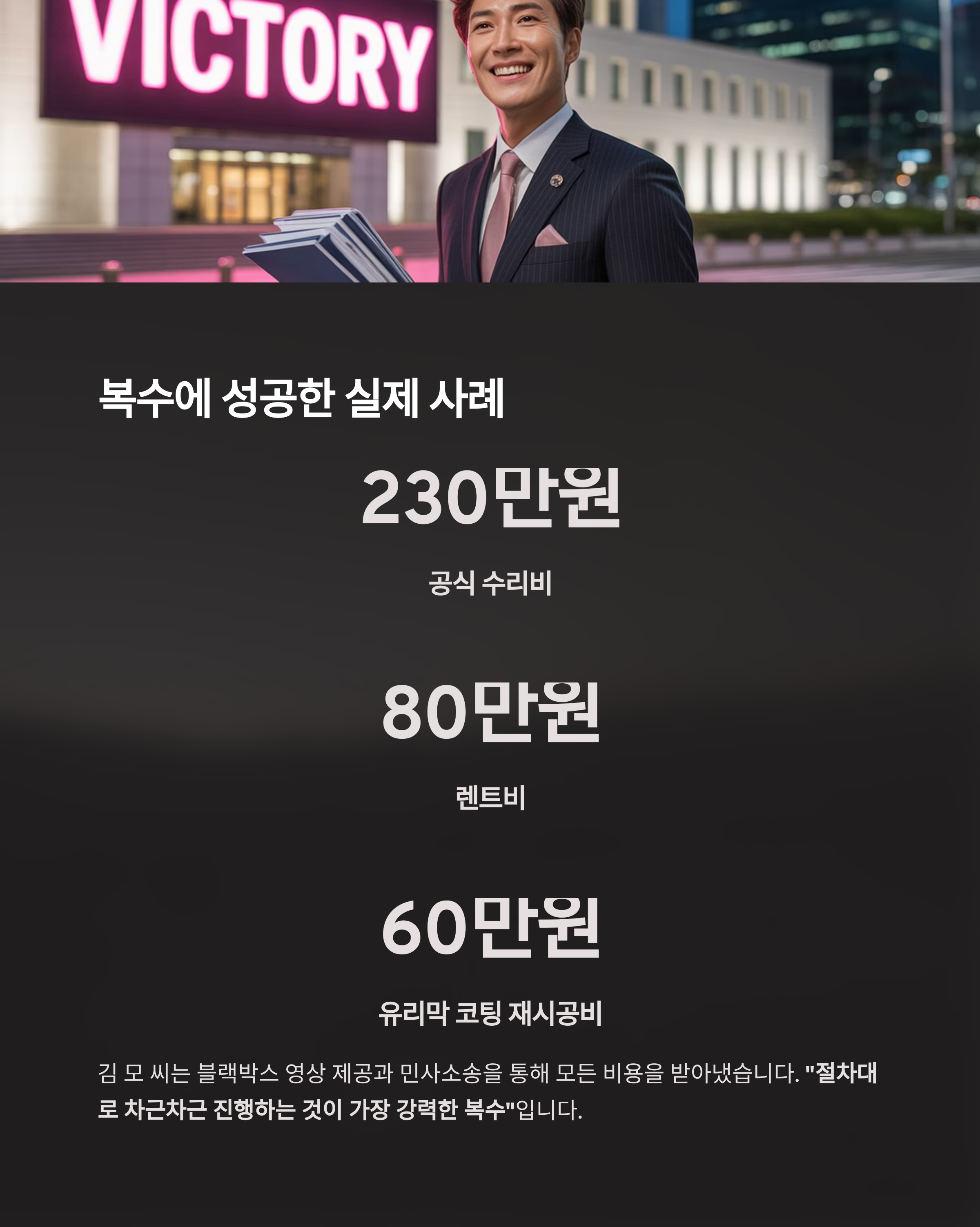 그 결과, 공식 수리비 230만 원, 렌트비 80만 원, 유리막 코팅 재시공비 60만 원을