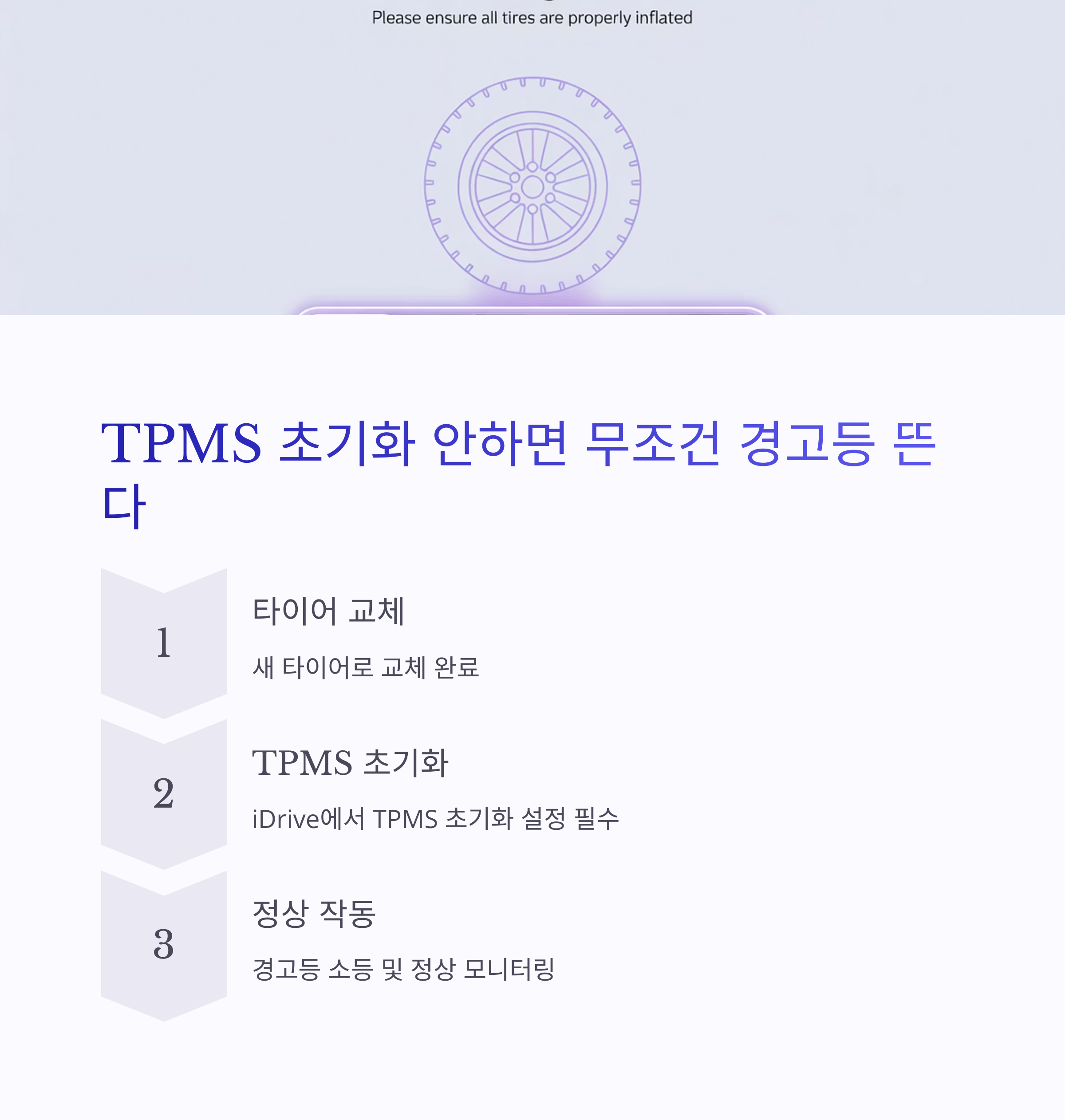 BMW는 타이어 교체 후 반드시 차량 내에서 TPMS를 초기화해야 합니다.