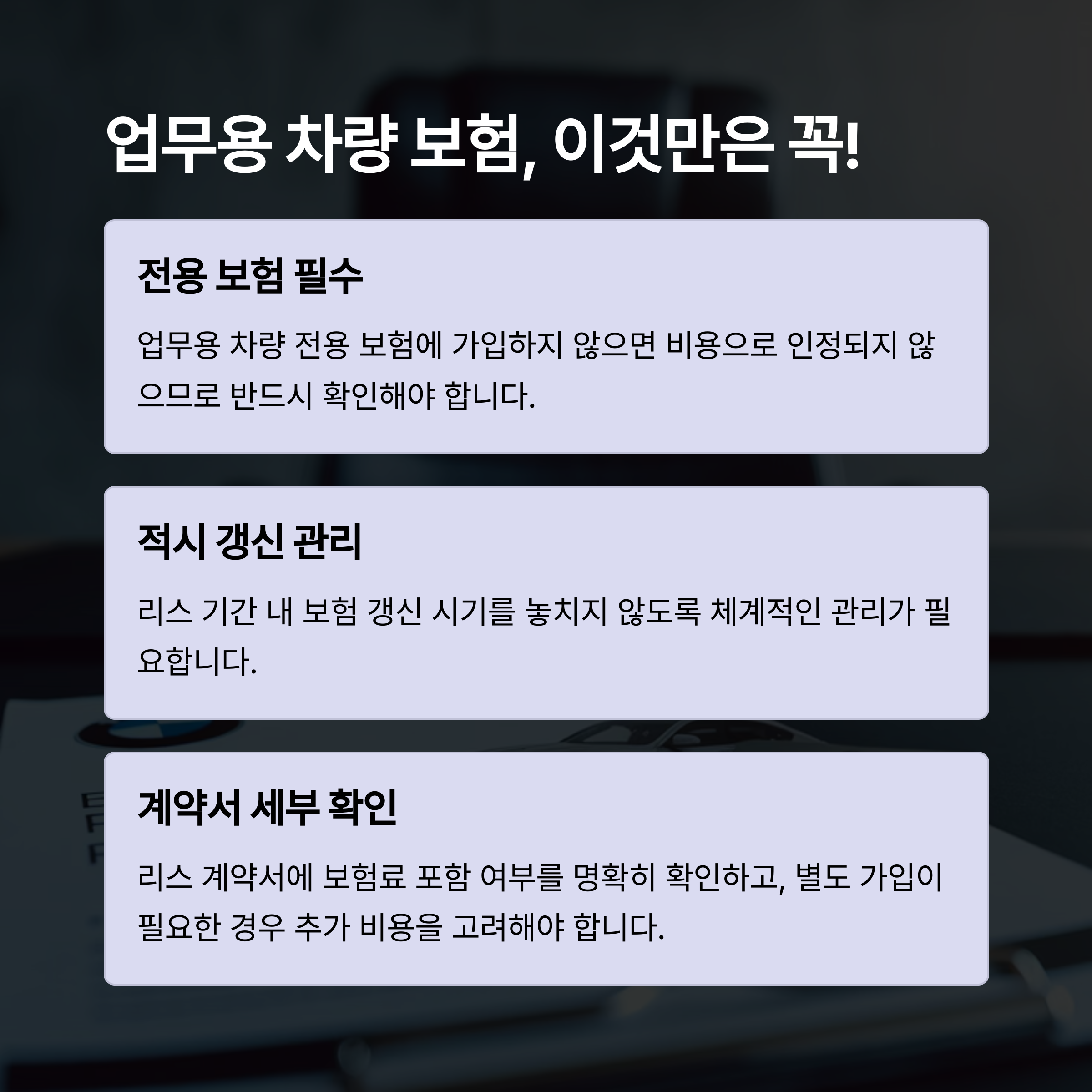 | 업무용 차량 보험 가입은 반드시 필요합니다. 업무용 전용 보험에 가입하지 않으면 비용인정을 받을 수 없습니다. 보험료는 차량 사용 목적 및 업무 비율에 따라 다르게 설정됩니다. 사고 발생 시 보상 문제를 사전에 방지하려면 반드시 적합한 플랜을 선택하세요. 장기 리스 차량의 경우, 리스 업체가 제공하는 보험 옵션도 검토 가능합니다. |