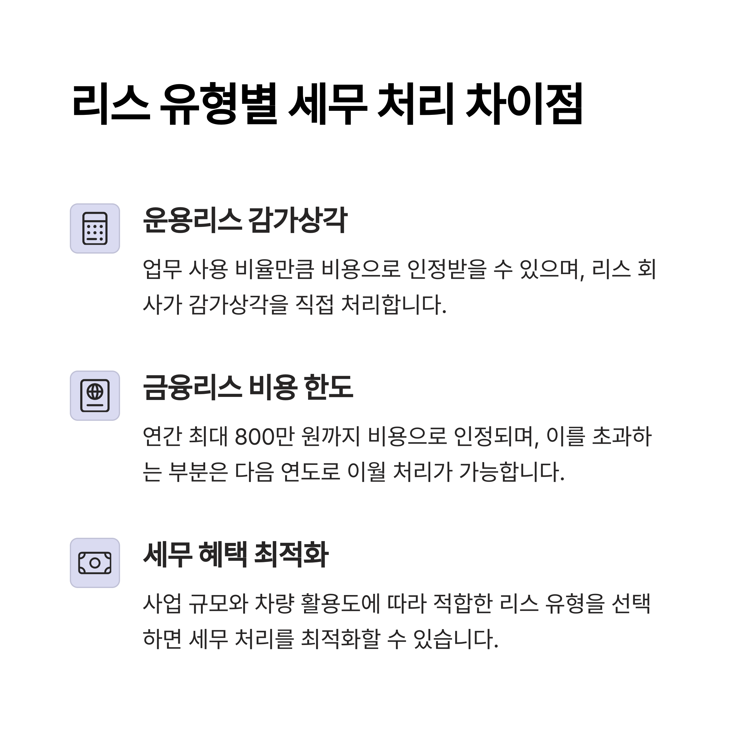 | 세무 혜택 | 비용 처리 가능 | 비용 처리 가능 | 감가상각 적용 |