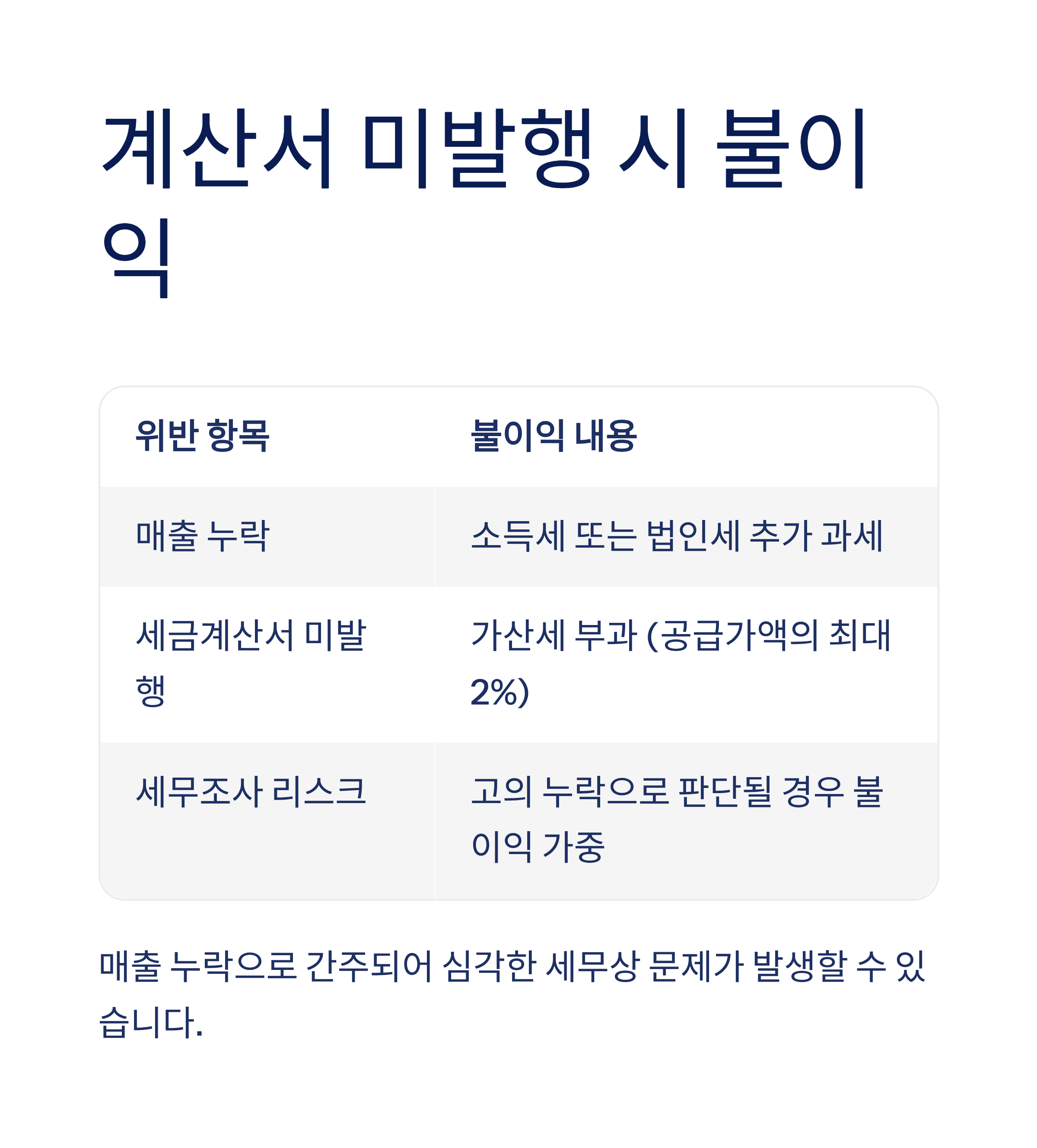 | 세금계산서 미발행 | 가산세 부과 (공급가액의 최대 2%) |