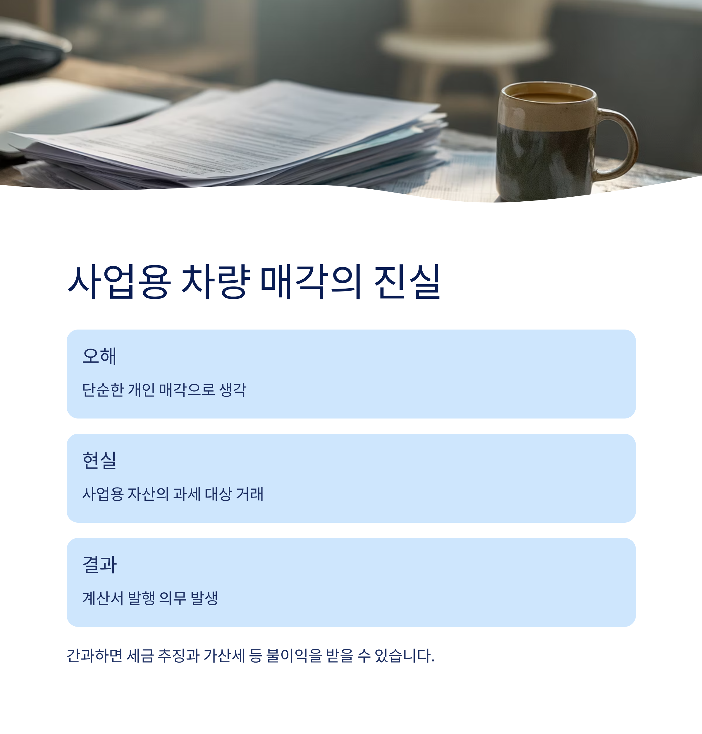 사업자가 보유하던 차량을 처분할 때, 많은 분들이 단순한 개인 매각으로 오해하는 경우가 많습니다. 하지만 이 차량이 사업용 자산으로 등록되어 있었다면, 매각 행위 또한 ‘과세 대상 거래’로 간주되어 계산서나 세금계산서를 반드시 발행해야 하는데요. 이를 간과하면 세금 추징이나 가산세 등의 불이익을 받을 수 있습니다. 이번 글에서는 사업자가 자동차를 팔 때 꼭 계산서를 발행해야 하는 이유와 그 배경을 쉽게 정리해드릴게요.