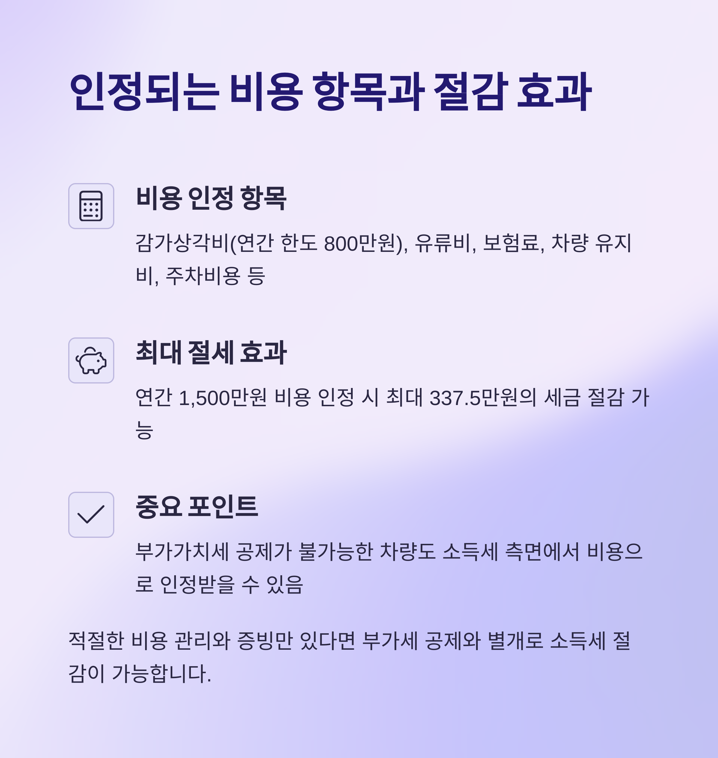업무용 주행거리 50% 이상을 입증해야 비용 인정. 2500cc 이상의 차량은 세금 부담 높아, 철저한 관리 필수.