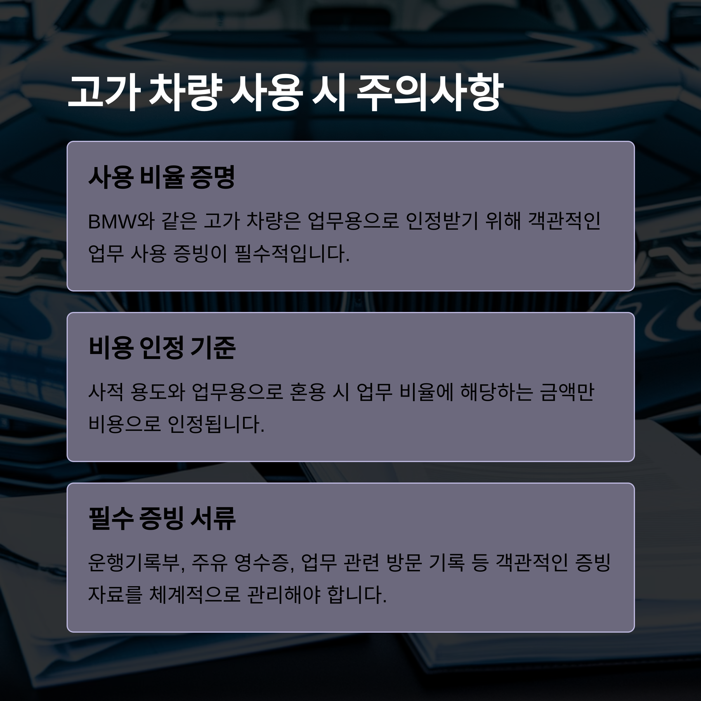 | 업무용 주행거리와 목적을 명확히 입증할 수 있어야 합니다. 월간 주행 기록과 사용 목적을 증빙하는 서류를 정확히 관리해야 합니다. 차량이 업무용으로 사용됨을 입증하지 못하면 일부 비용이 반려될 수 있습니다. 특히 BMW 고급 모델은 업무 적합성을 세부적으로 증명해야 합니다. 정기적인 세무 컨설팅을 통해 차량 운행과 비용 처리를 사전에 점검하는 것이 중요합니다. |