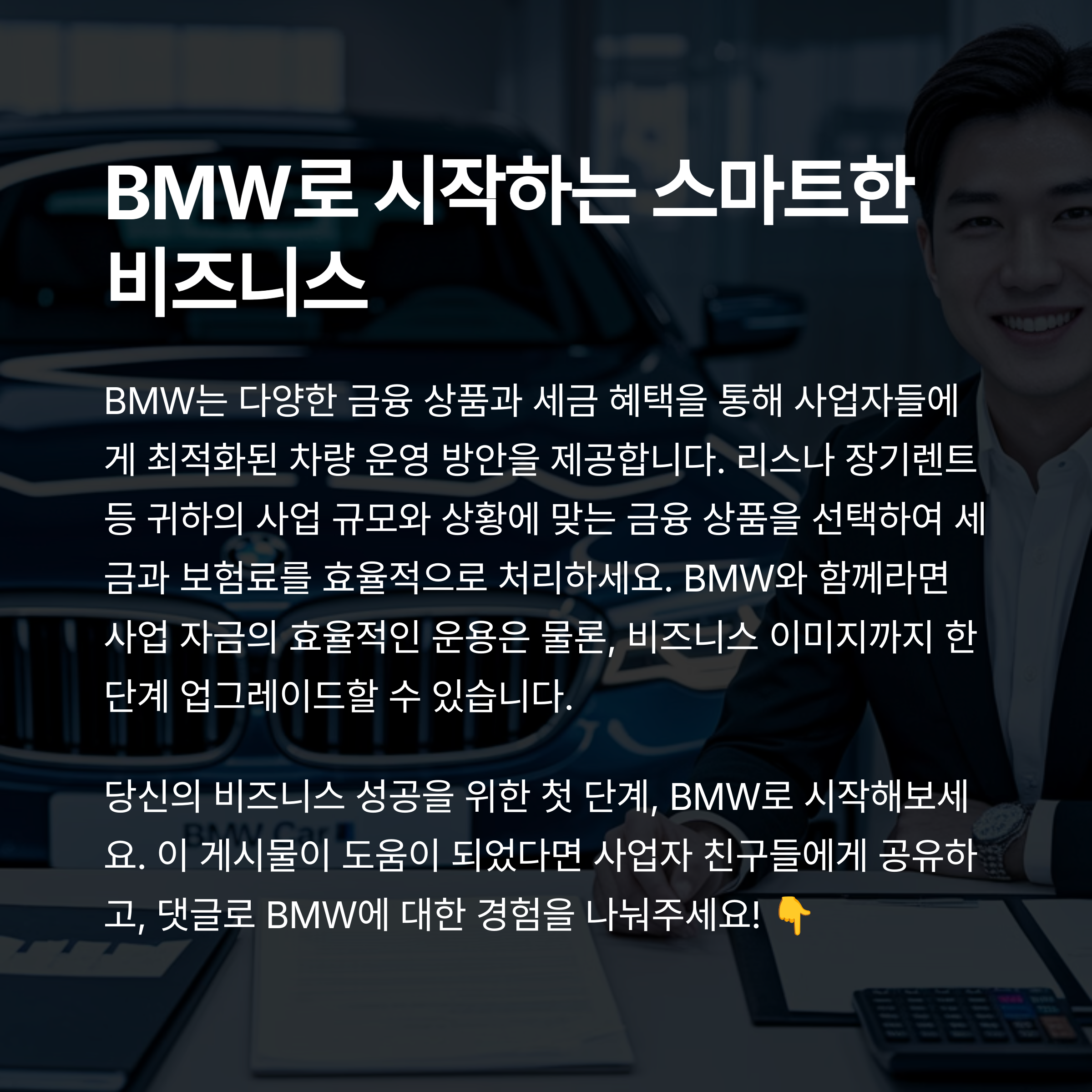 세제혜택 활용과 관리비 절감 측면에서 뛰어난 효율을 발휘합니다. BMW의 사업자 차량 선택은 신뢰성과 지속가능성을 제공하는 현명한 투자입니다.
