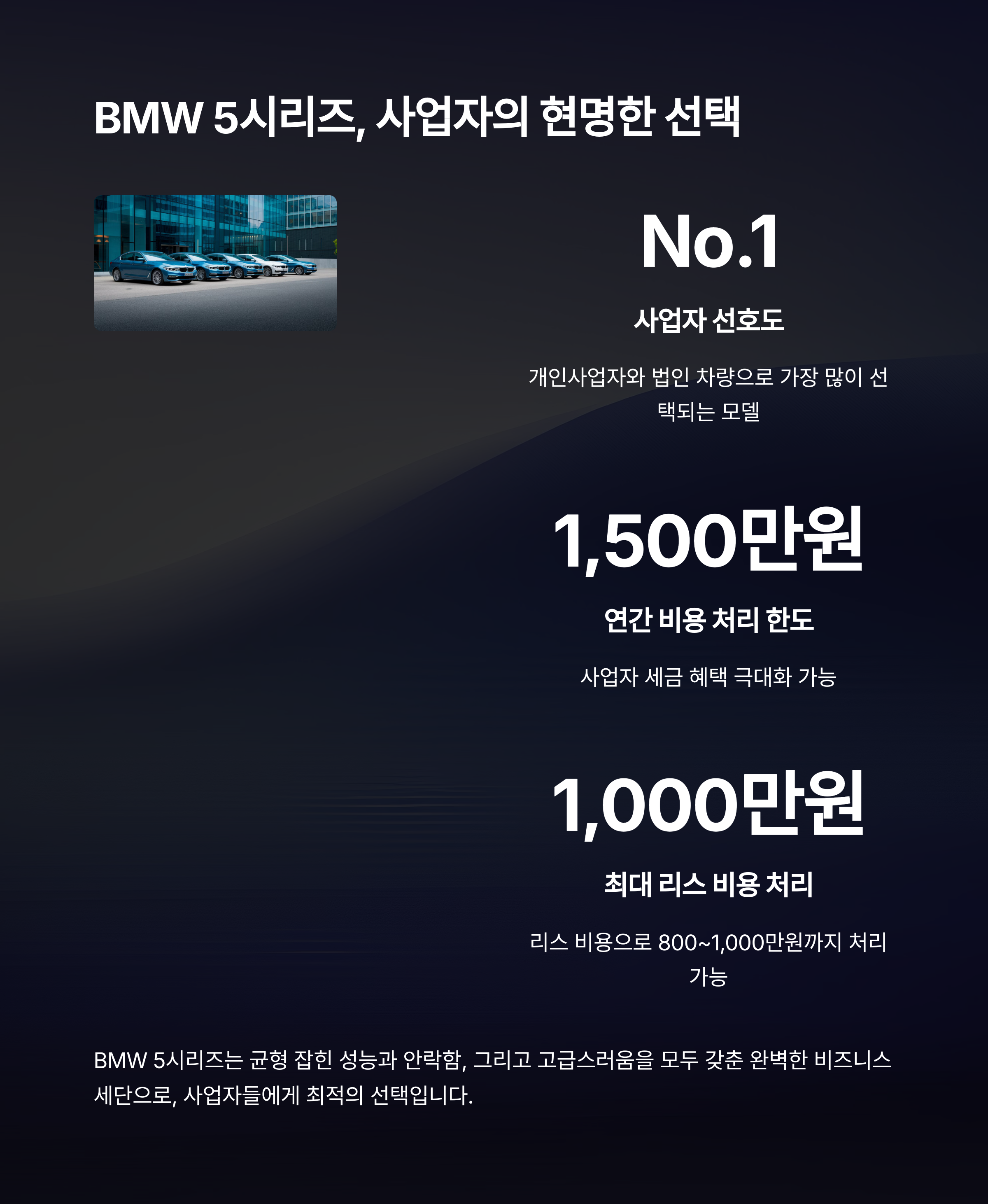 BMW는 항상 최고급 성능과 품질을 자랑하며, 사업자 차량 시장에서도 가장 먼저 고려되는 선택지 중 하나입니다.