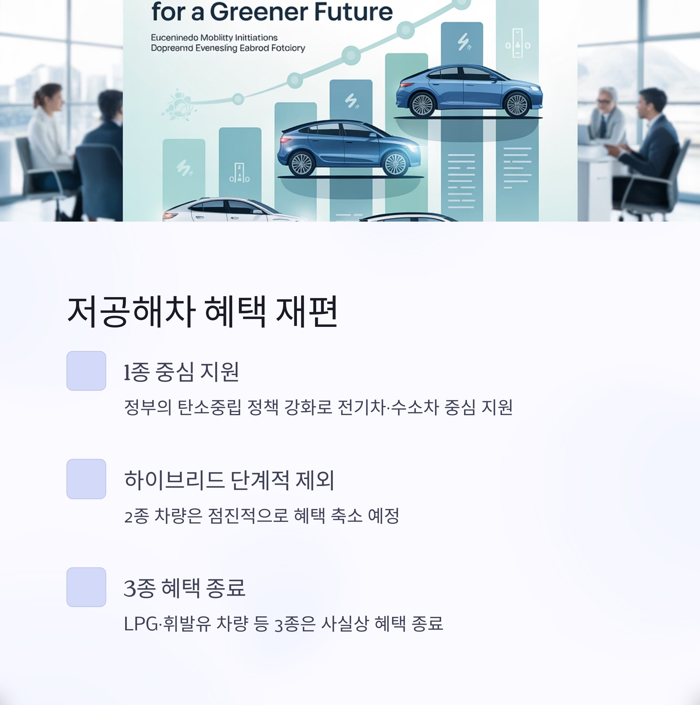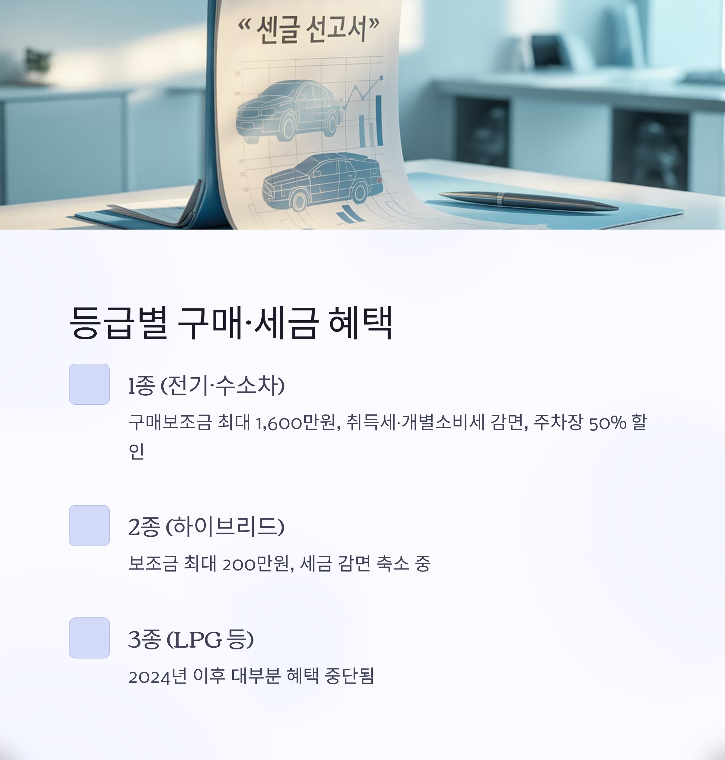 | 1종 | 전기차, 수소차, 천연가스차 등 | 혜택 유지 및 강화 |