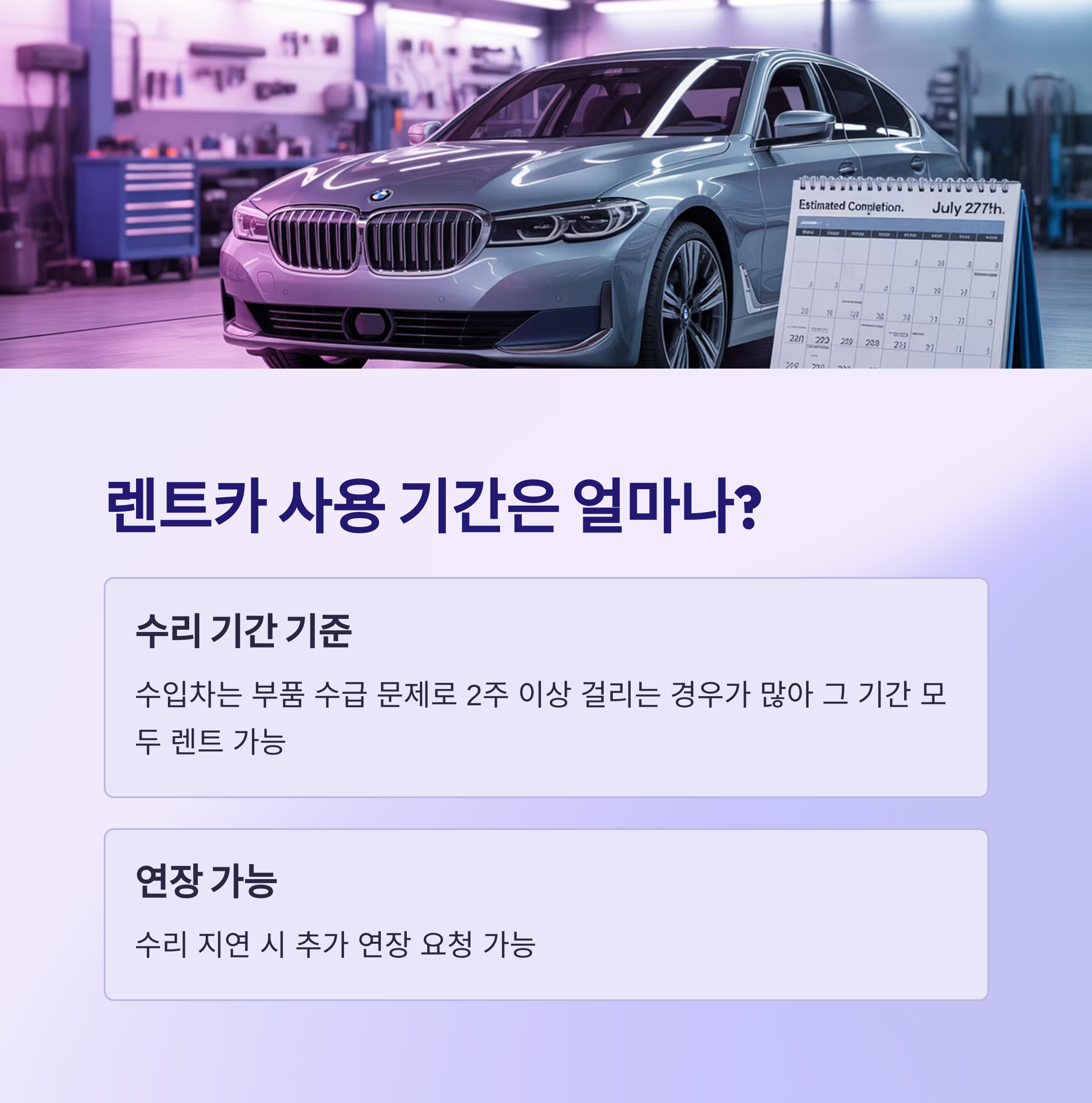 렌트카 제공 기간은 수입차 부품 수급과 수리 기간에 따라 유동적입니다.
