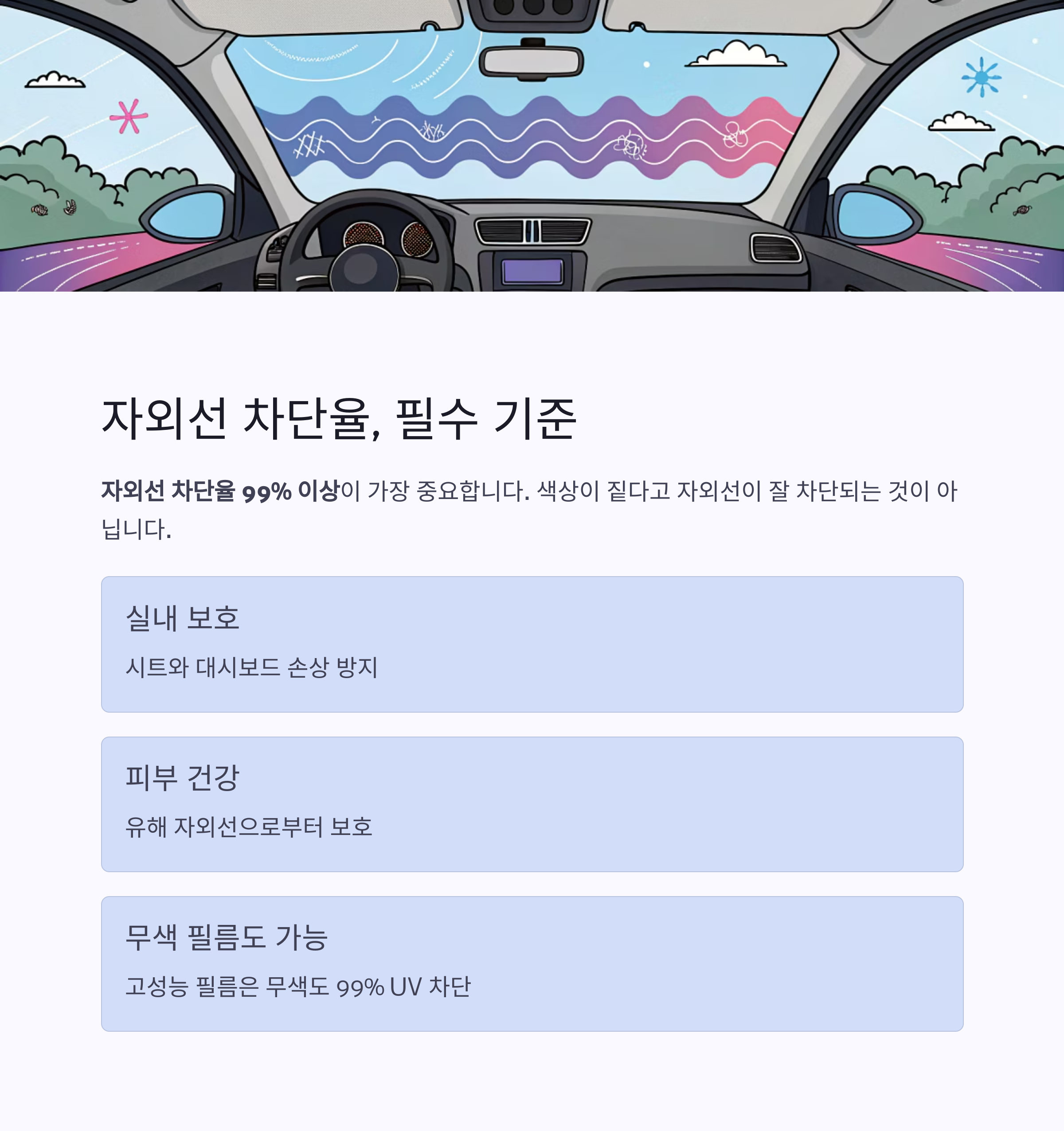 단순히 짙은 색을 고르는 문제를 넘어, 실내 보호와 운전자 건강에 직접적인 영향을 주는 중요한 선택입니다.