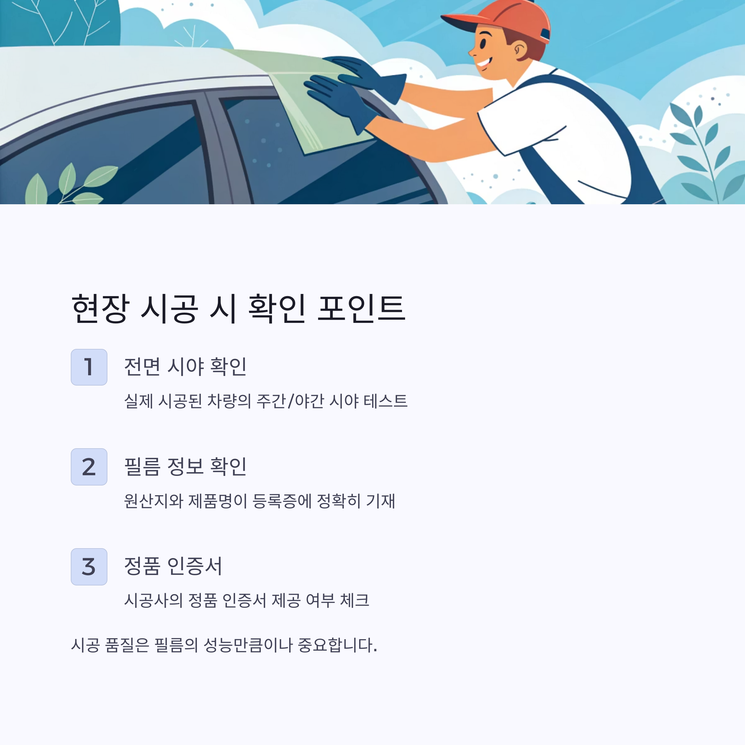 "실제 시공된 차의 전면 시야, 야간 반사 테스트 확인"은 필수입니다.