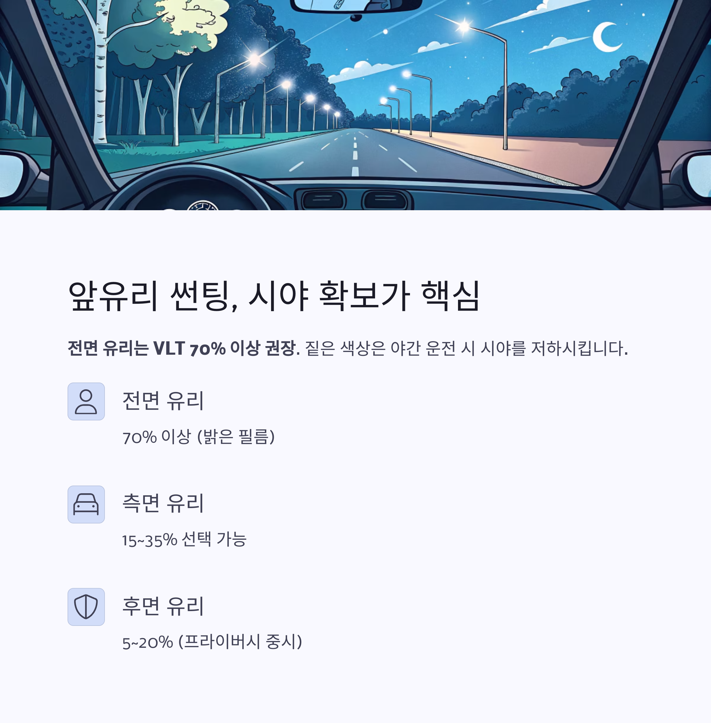 전면 유리는 운전 시 시야 확보가 중요하므로 VLT(가시광선 투과율) 70% 이상을 권장합니다.