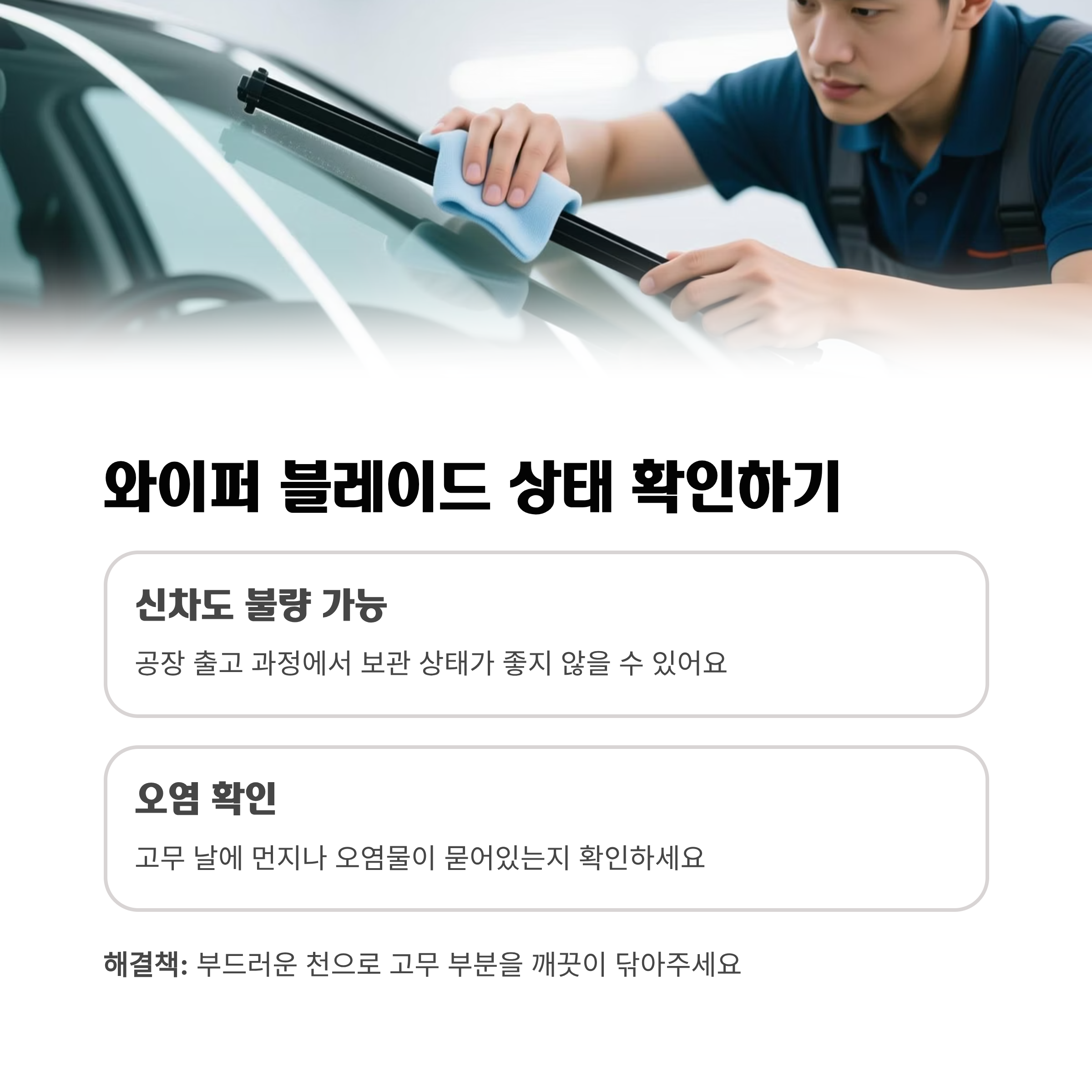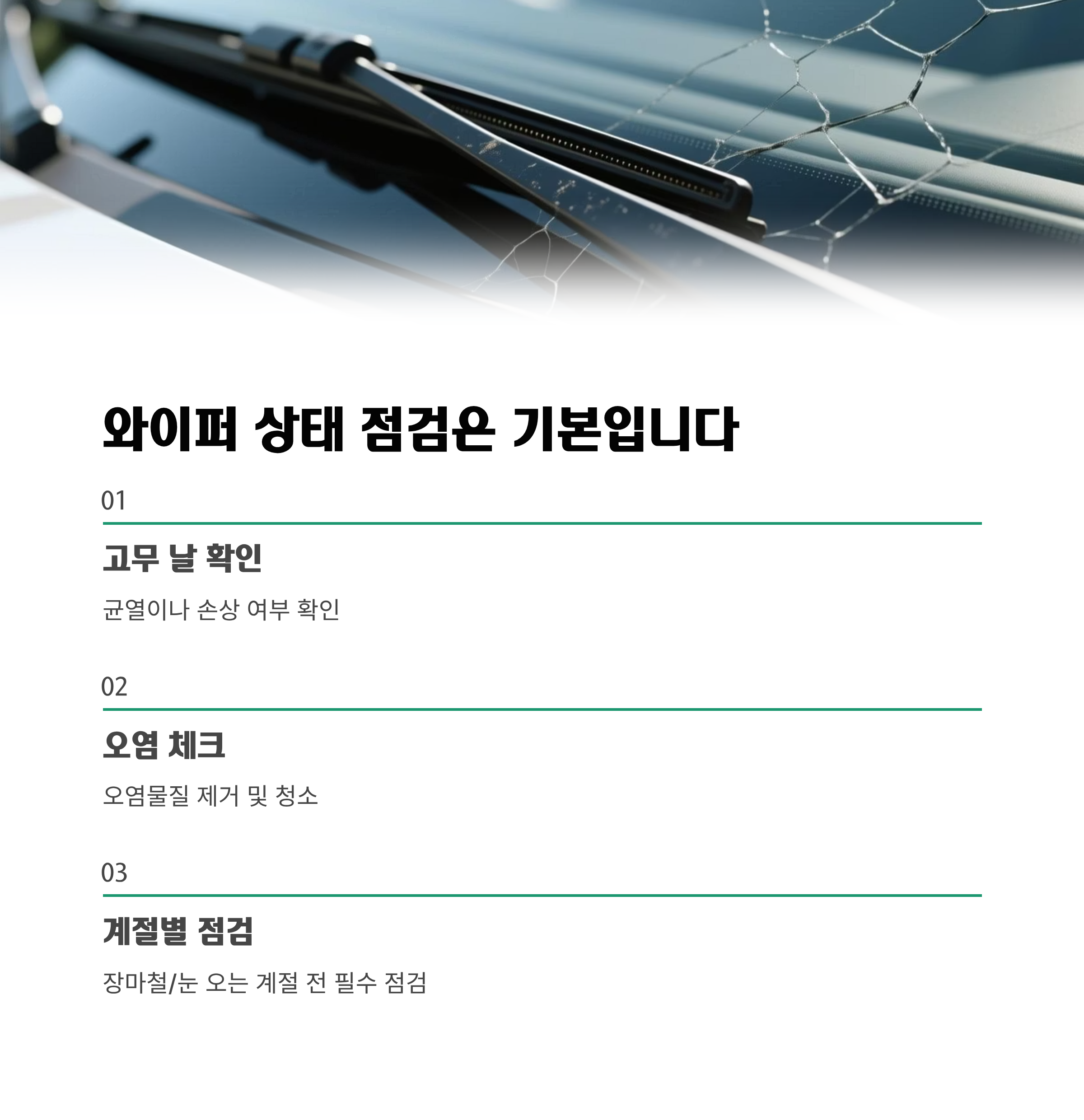 와이퍼도 꼭 확인하세요. 고무 날의 균열, 오염, 이상 유무는