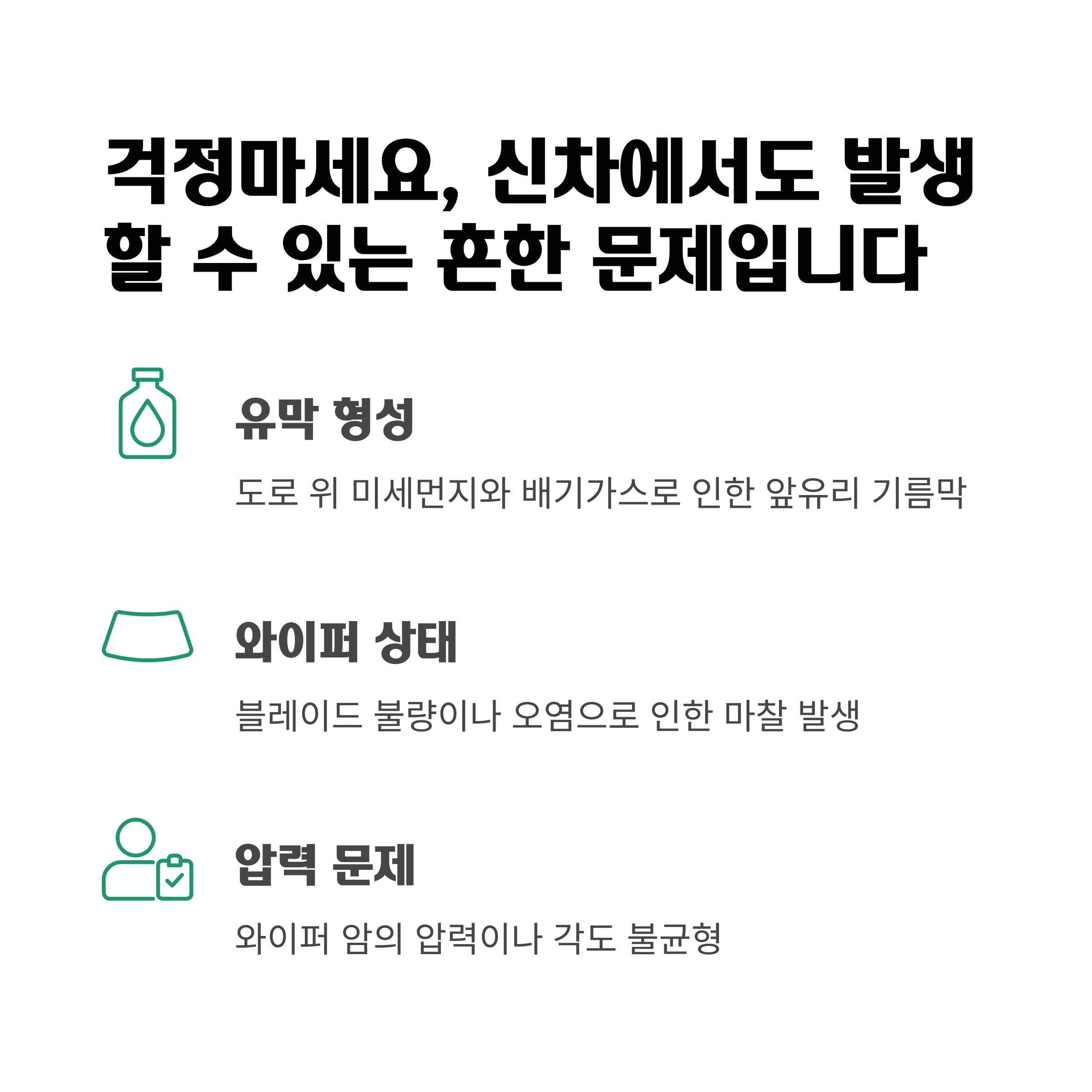 대부분 간단한 점검과 조치로 해결이 가능합니다. 본문에서는 유막, 와이퍼 상태,