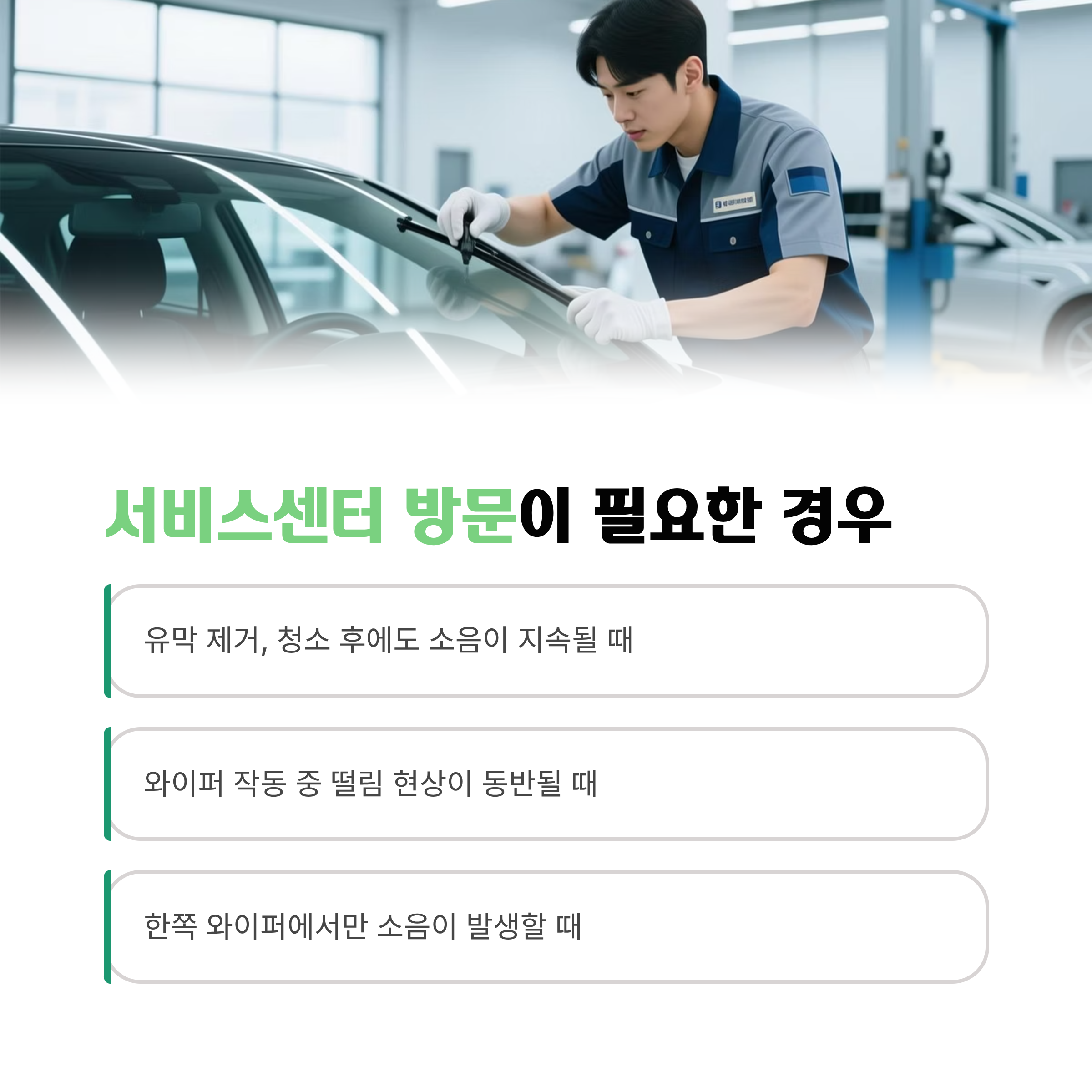 | 유막 제거, 청소 후에도 소음 지속 | 와이퍼 교체 또는 각도 조정 필요 |