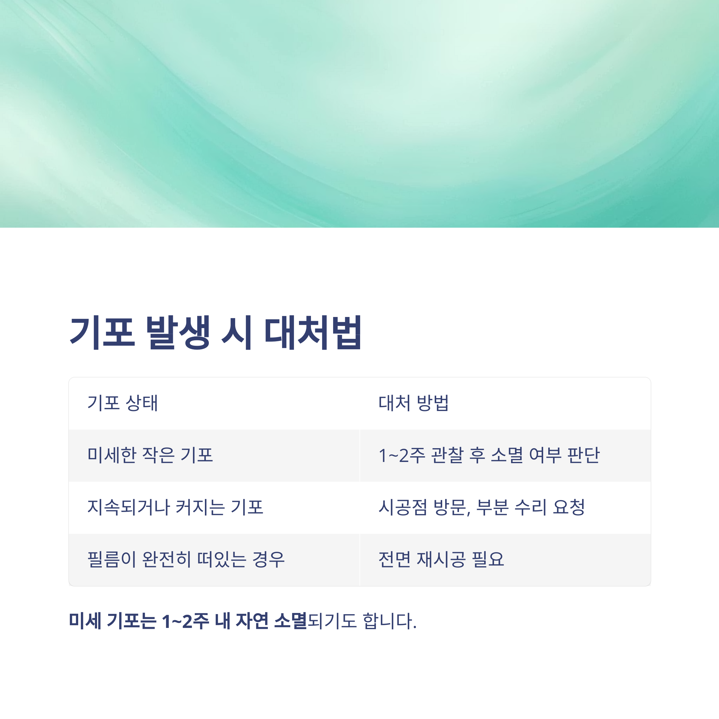| 지속되거나 커지는 기포 | 시공점 방문, 부분 수리 요청 |