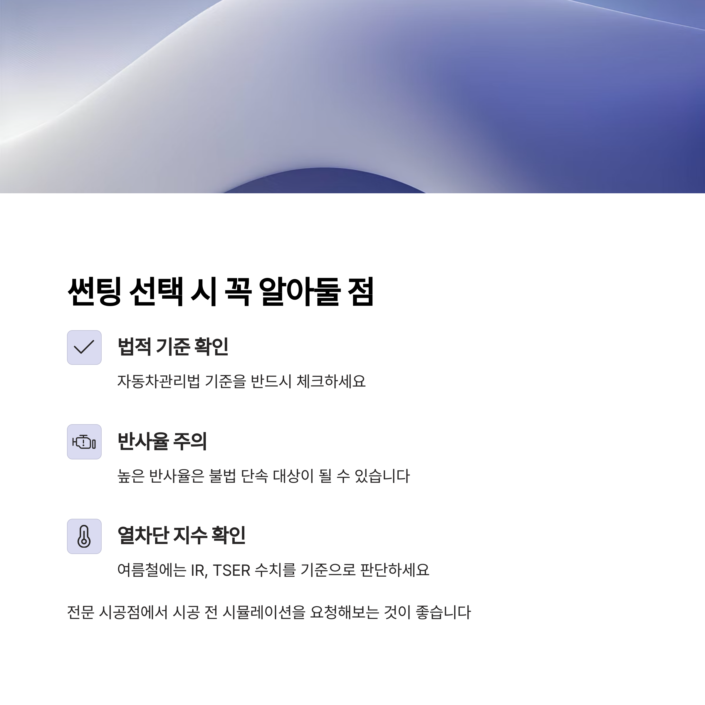 - 필름 스펙을 확인하고 자동차관리법 기준을 반드시 체크하세요