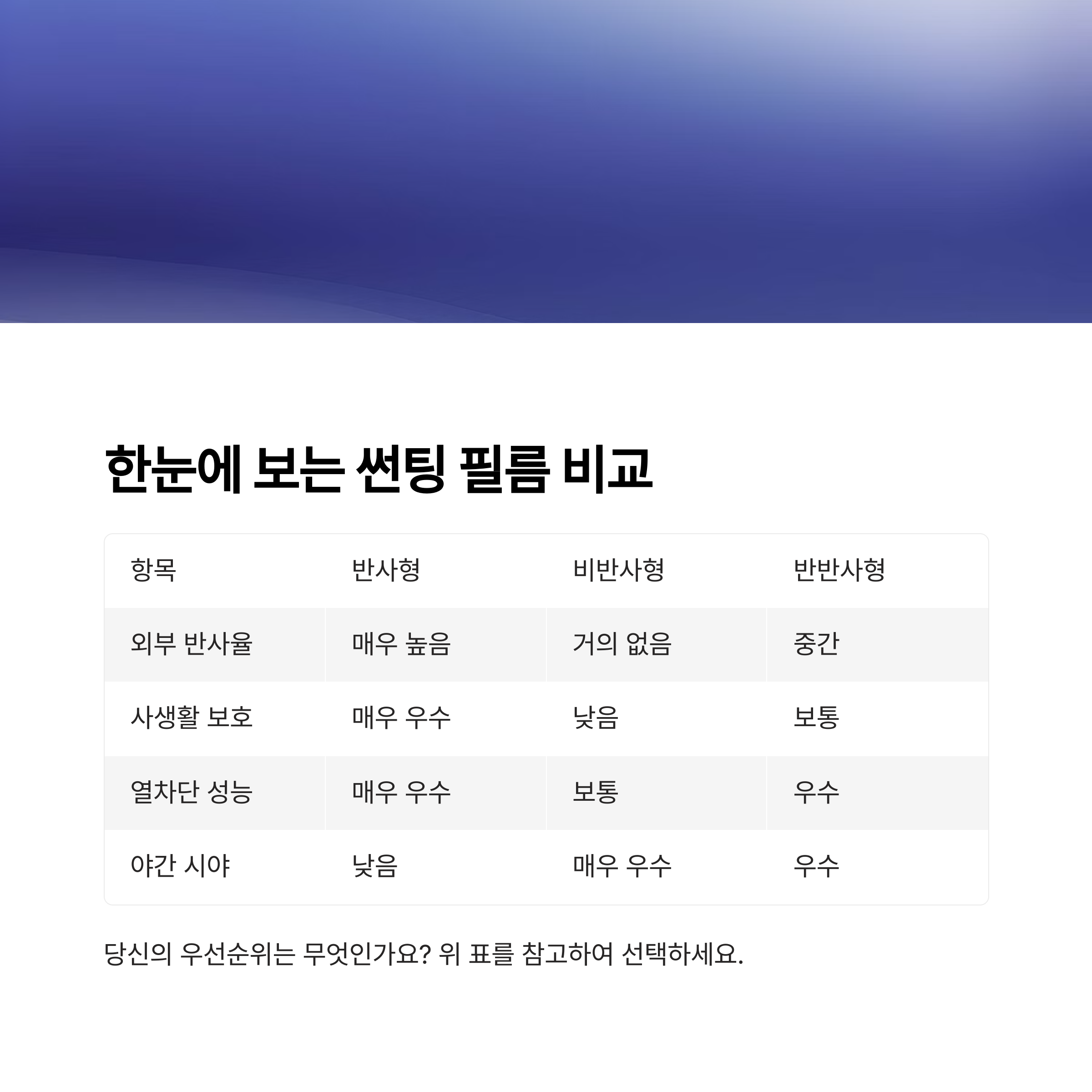 각각 외부 반사율, 실내 시야 확보, 열차단 성능 등이 다릅니다